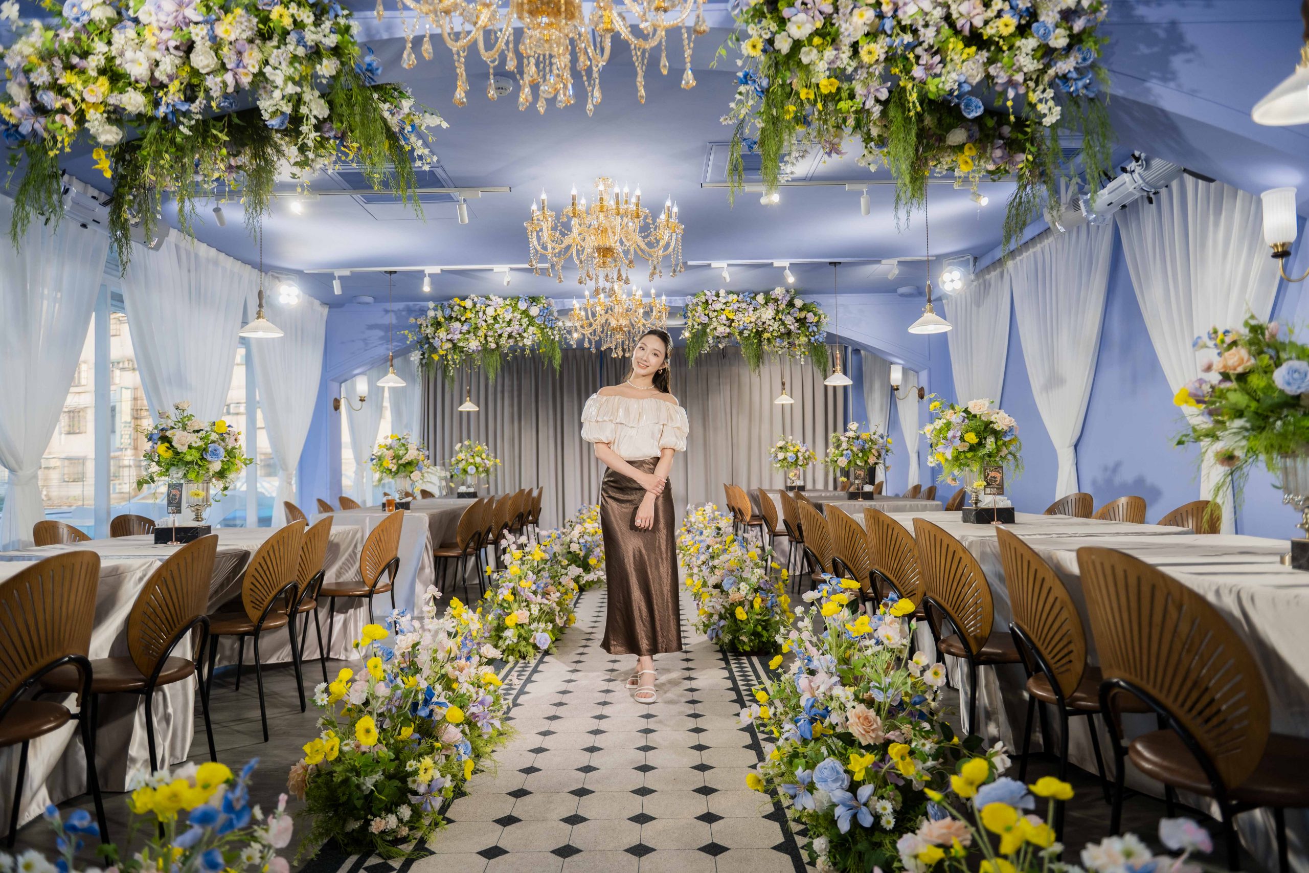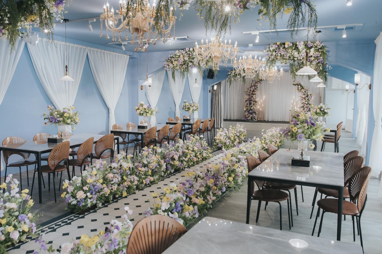 淡紫丁香色的空間如夢境般延展,花彩以紫、黃、白色交疊,讓整個場地猶如夢境般羅曼蒂克!