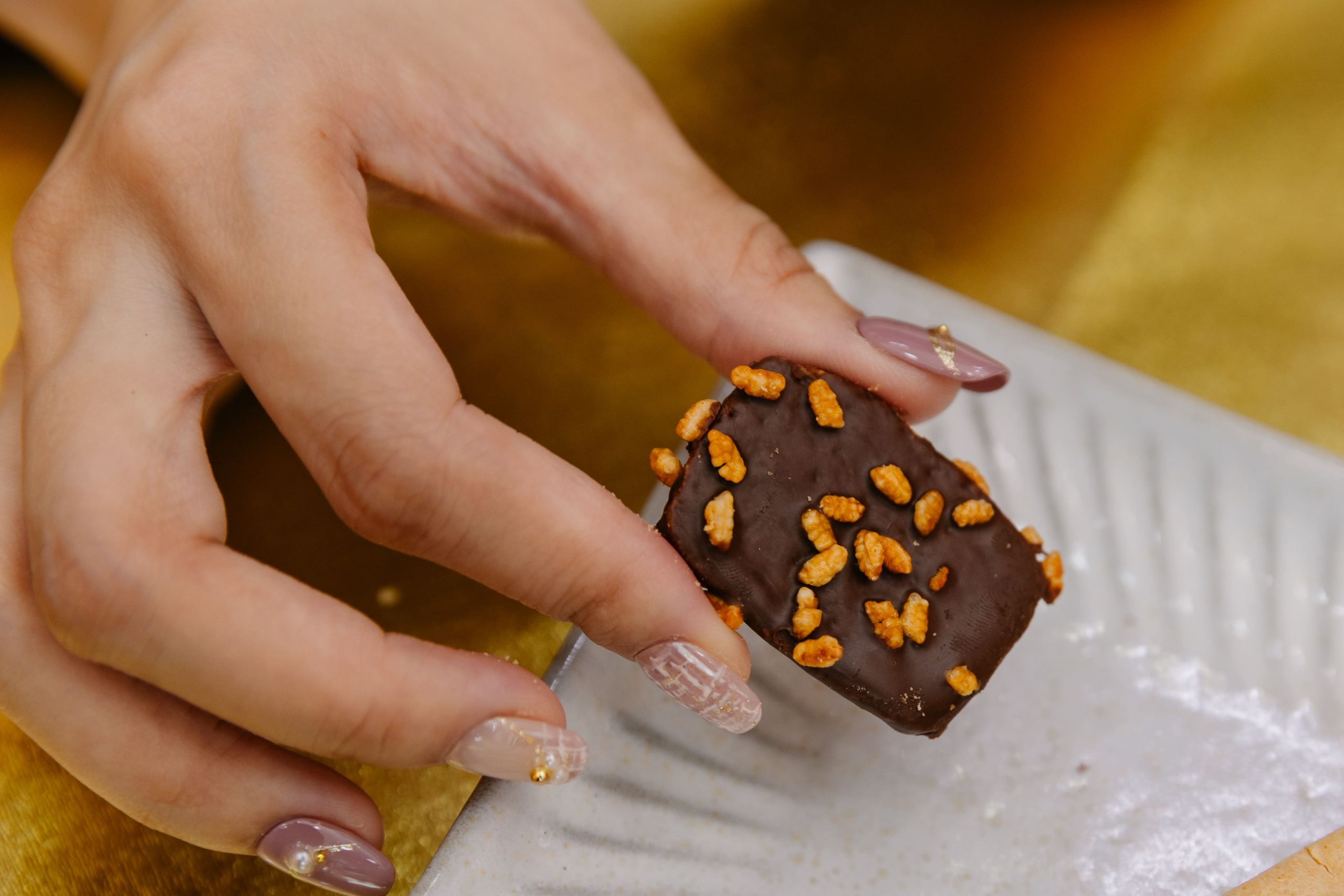 底層奶酥的酥鬆感,搭配上層巧克力塗層的薄脆感,以及最上層玄米粒的酥脆焦香,