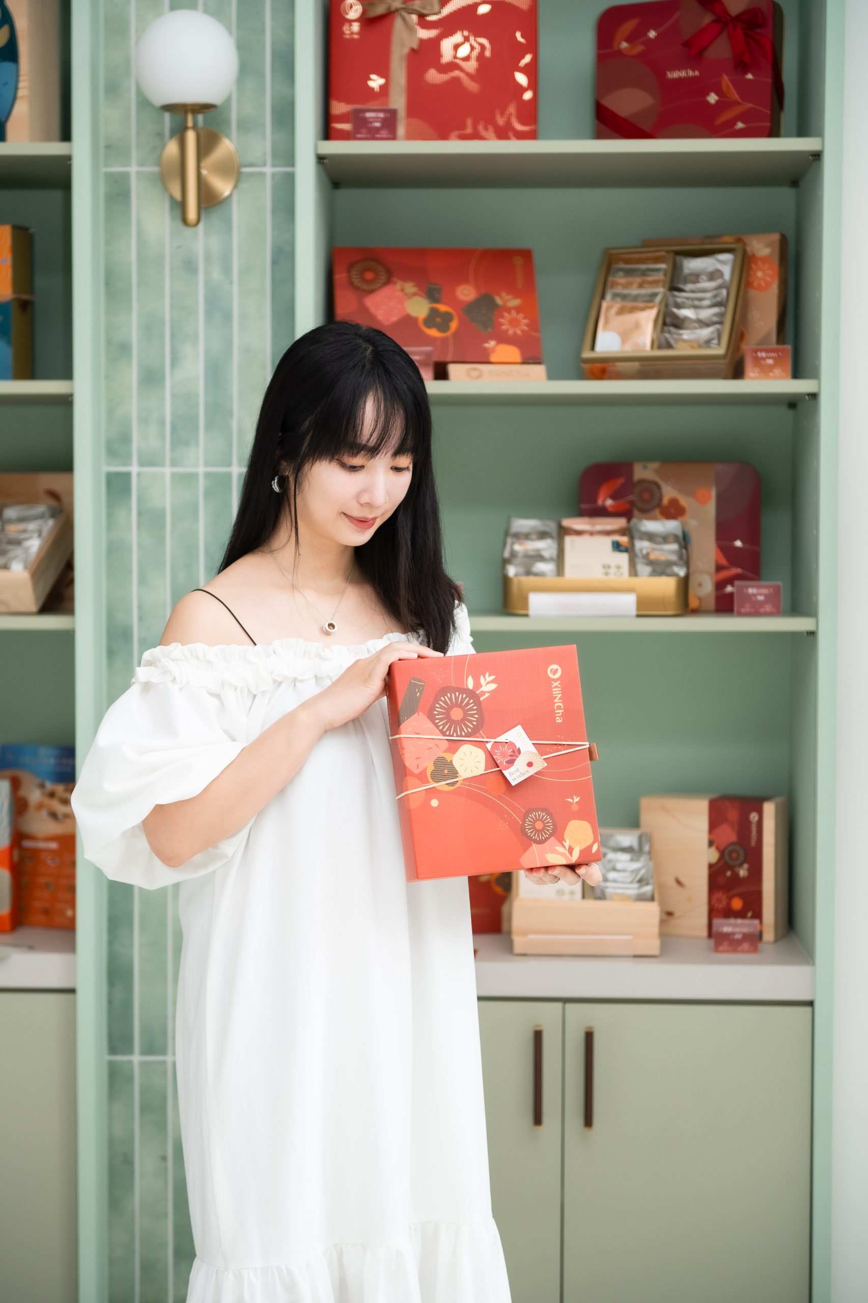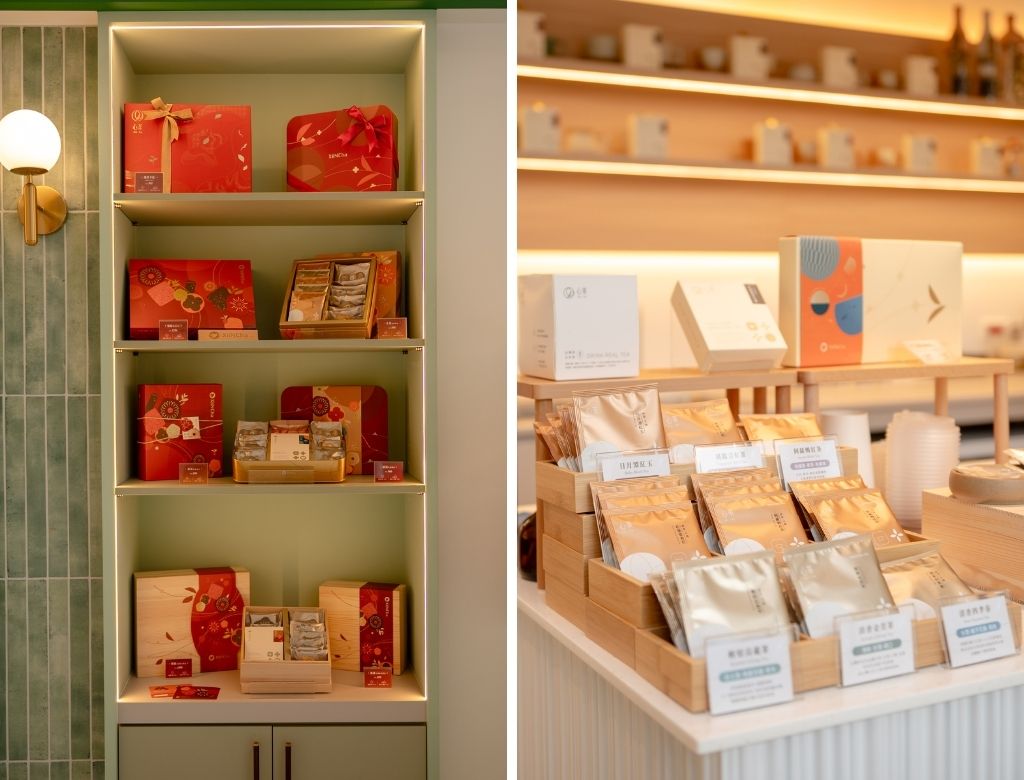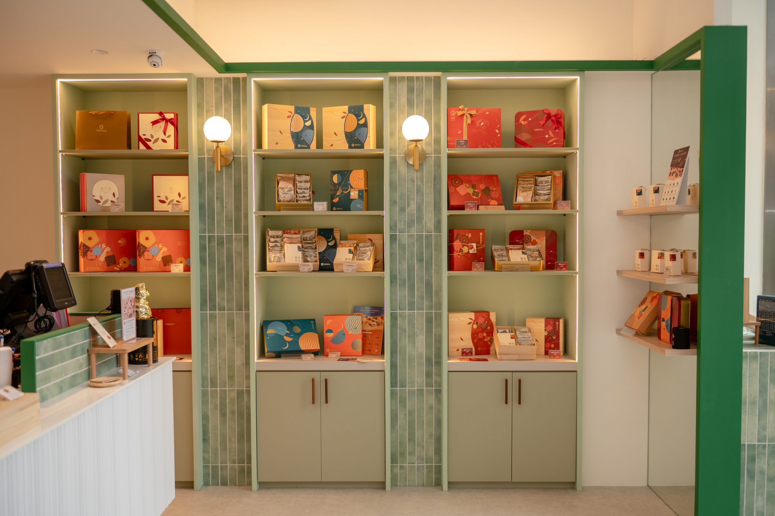 「清新抹茶綠」搭配溫潤的原木色和乾淨純白色,光是視覺上就覺得很療癒。最吸睛的是產品展示牆,薄荷綠的立體磁磚搭上溫暖的圓形壁燈,讓架上的喜餅禮盒看起來像精品一樣,質感立刻衝上去了!