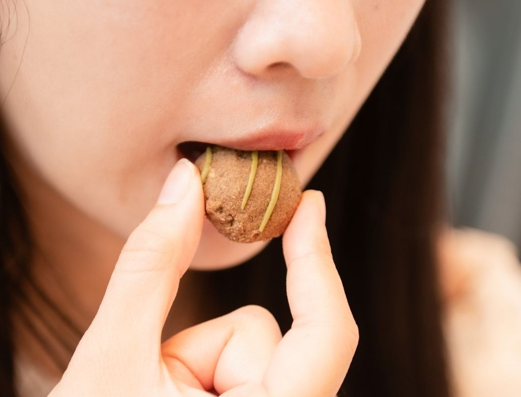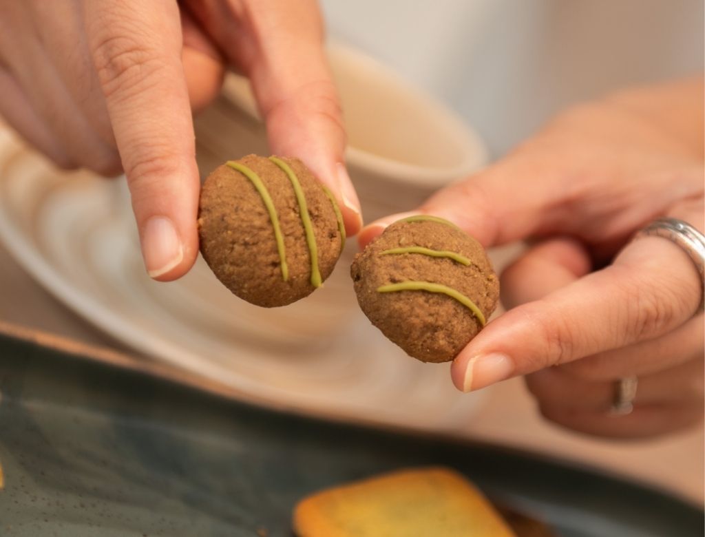 小圓球造型+抹茶配色超可愛。一口咬下,帶有煙燻感的焙茶香味,隨後融進了堅果的烘烤香氣。它的甜度極低,茶香濃烈且風味獨特。