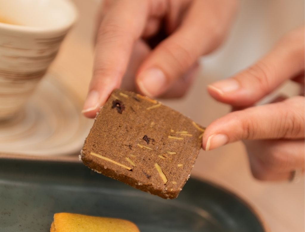 看起來很像巧克力餅乾,但其實也是茶味點心喔!餅乾散發著濃郁的台茶18號紅玉茶香,裡面脆杏仁片提供恰到好處的焦脆嚼感,還搭配上一些果乾,嚼起來口感非常豐富!