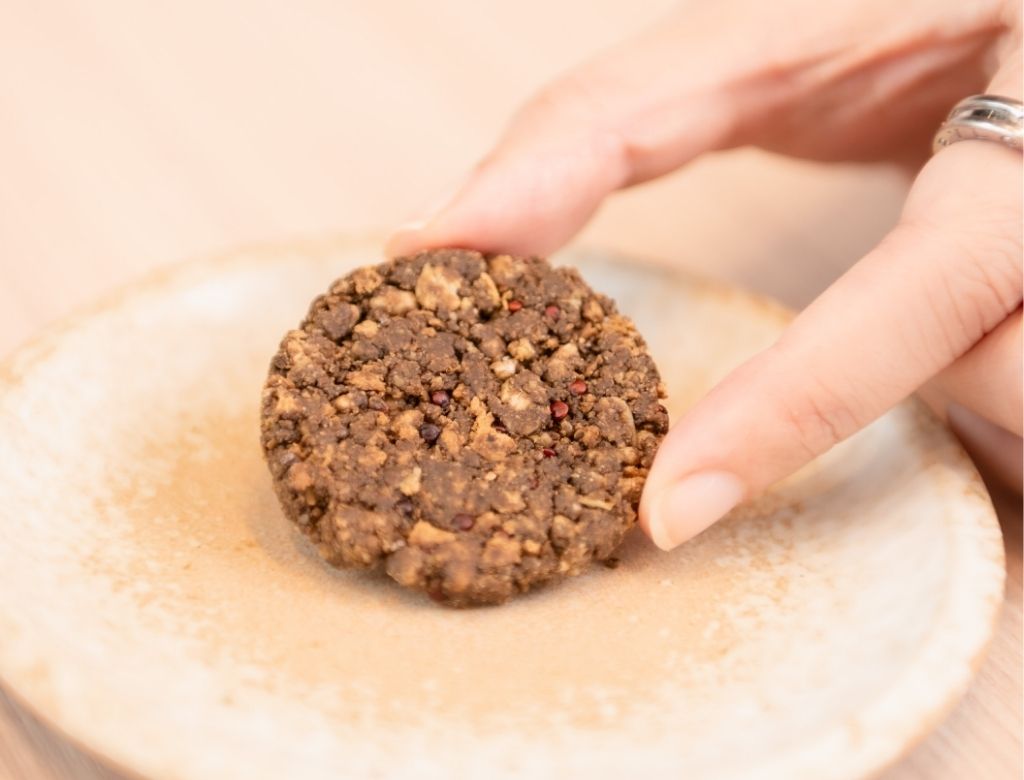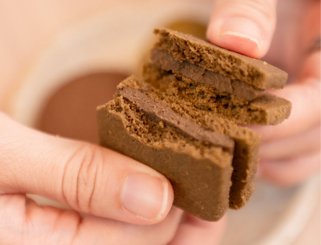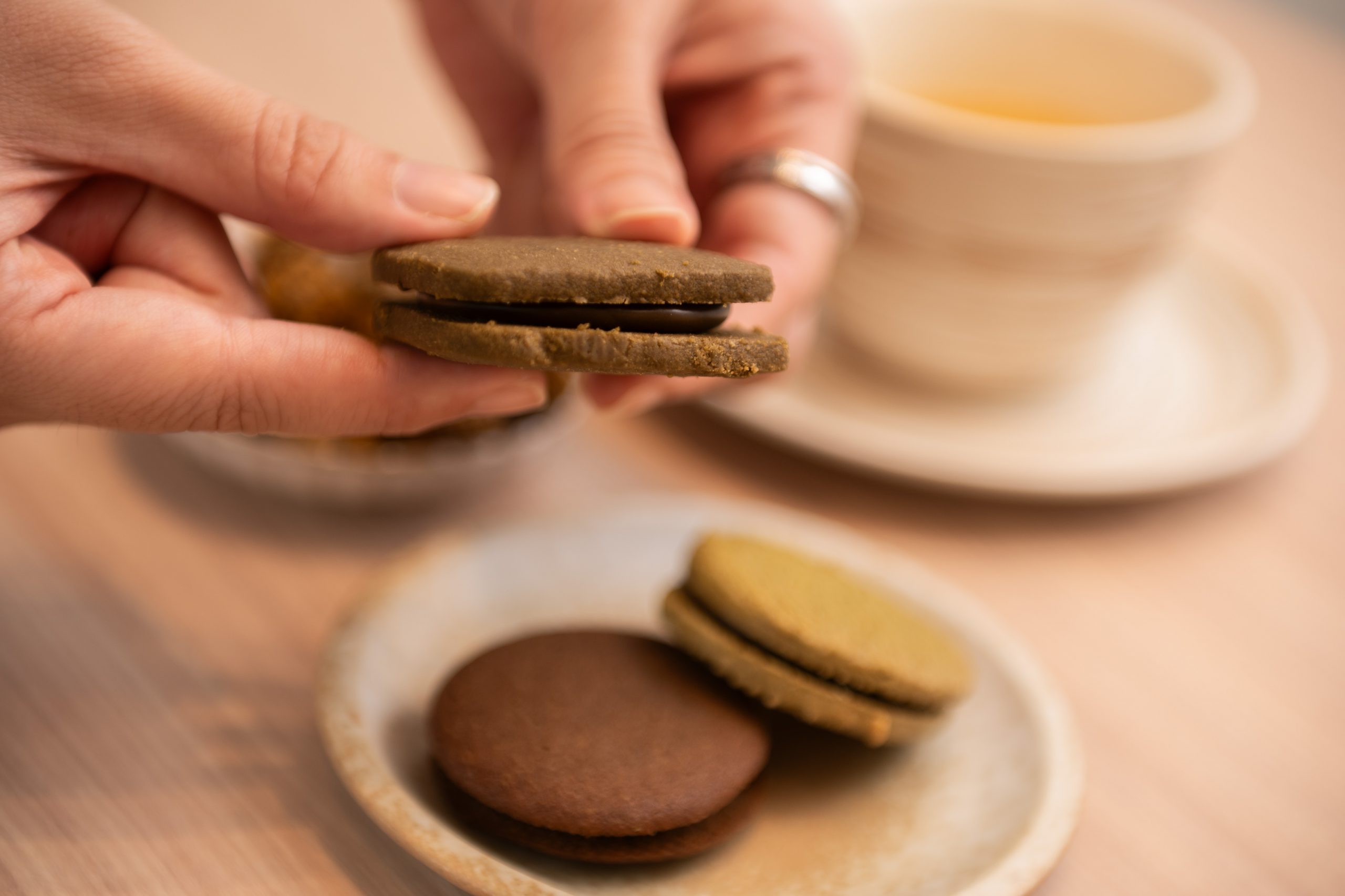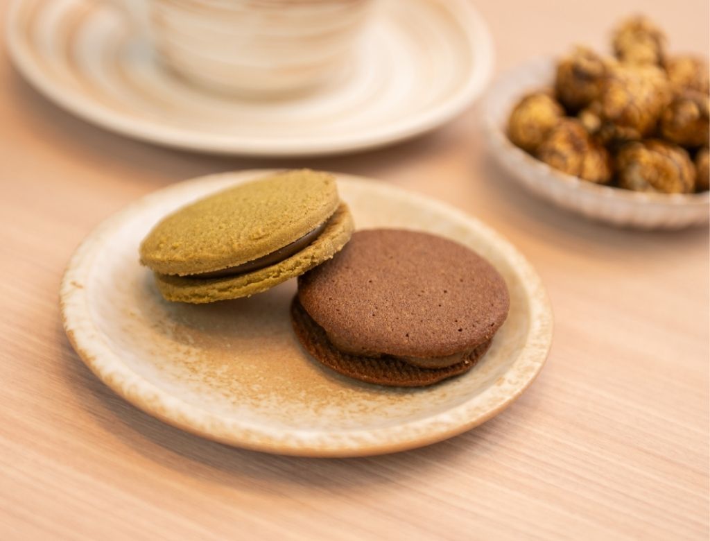 厚實圓潤的深褐色焙茶餅體,中間夾著飽滿的內餡,光看就充滿了實在感。餅乾本身是日式鬆軟口感,焙茶獨有的焦香與堅果底蘊,搭配濃郁的夾心,整體風味溫暖且富有深度。