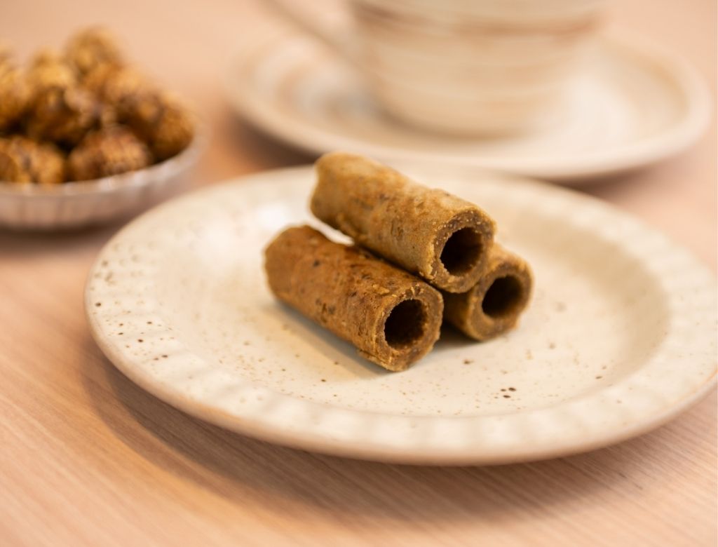 日式蛋捲有兩種口味,蛋捲香氣濃郁,完全不會有油膩感。奇亞籽和藜麥的顆粒感增加咀嚼樂趣,讓酥脆中帶一點健康感,非常耐吃,長輩一定會喜歡。