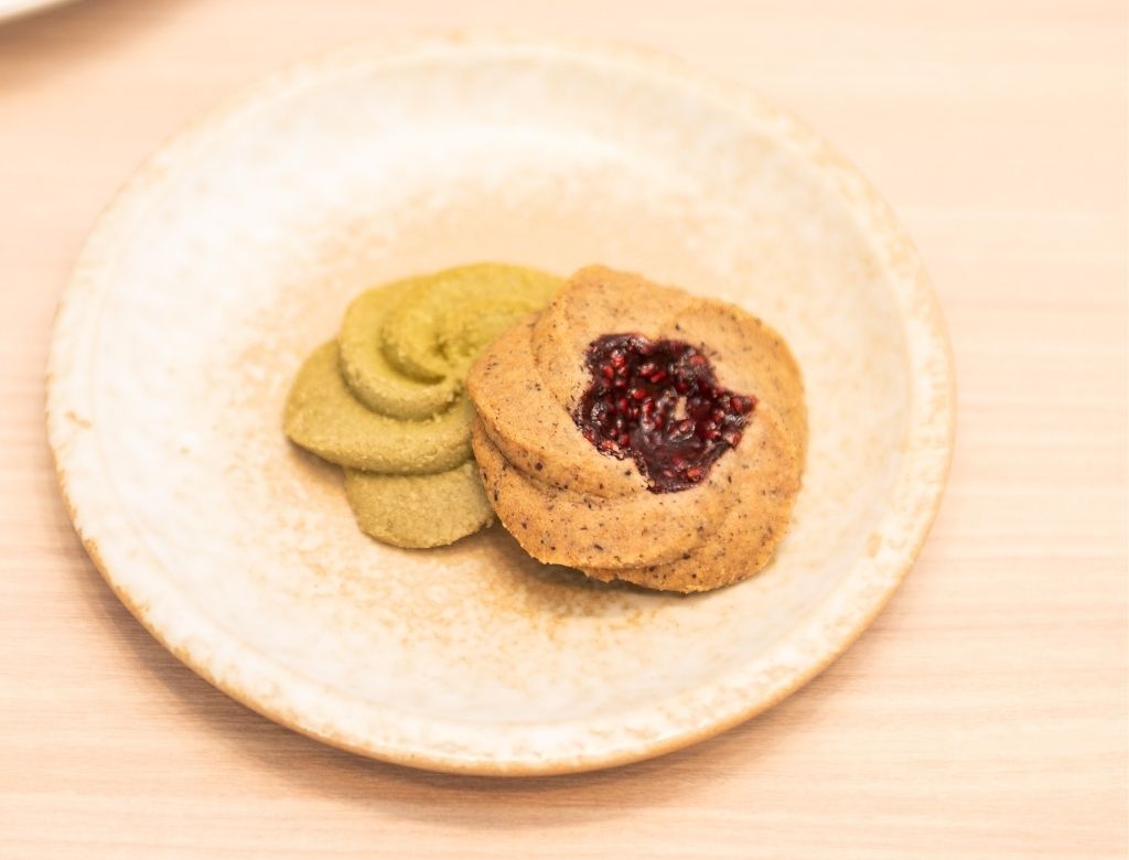 右邊「阿薩姆果醬曲奇」,深色的阿薩姆茶餅體中央點綴著一顆閃耀的莓果果醬。餅乾體帶著成熟紅茶的厚實香氣,口感酥脆。