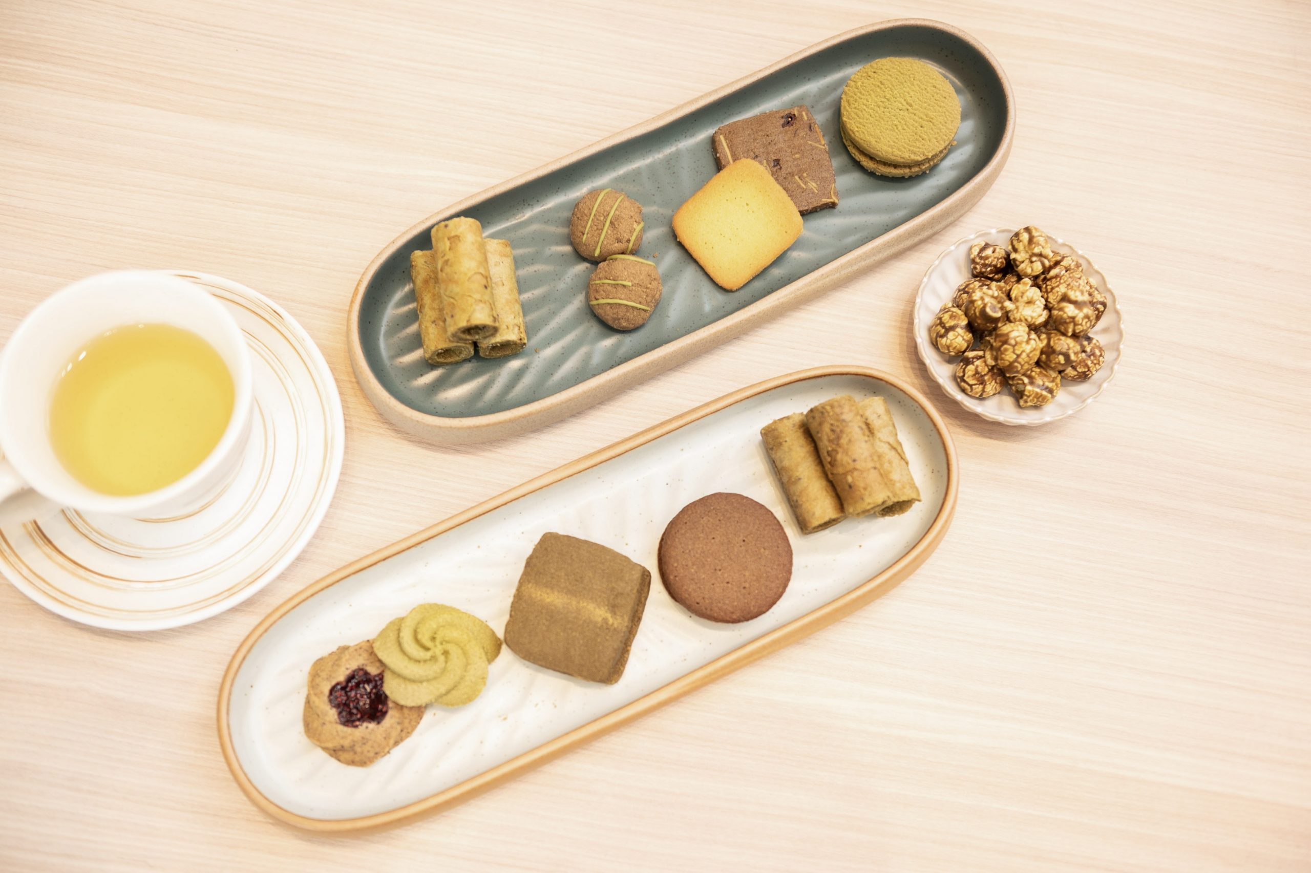 左邊「金萱馥郁茶花曲奇」,口感是曲奇特有的酥鬆細膩,一咬即化。它不像其他茶餅那樣強調濃烈茶韻,而是將金萱茶香化為一種療癒的底蘊,會讓人很想搭配熱茶享受。