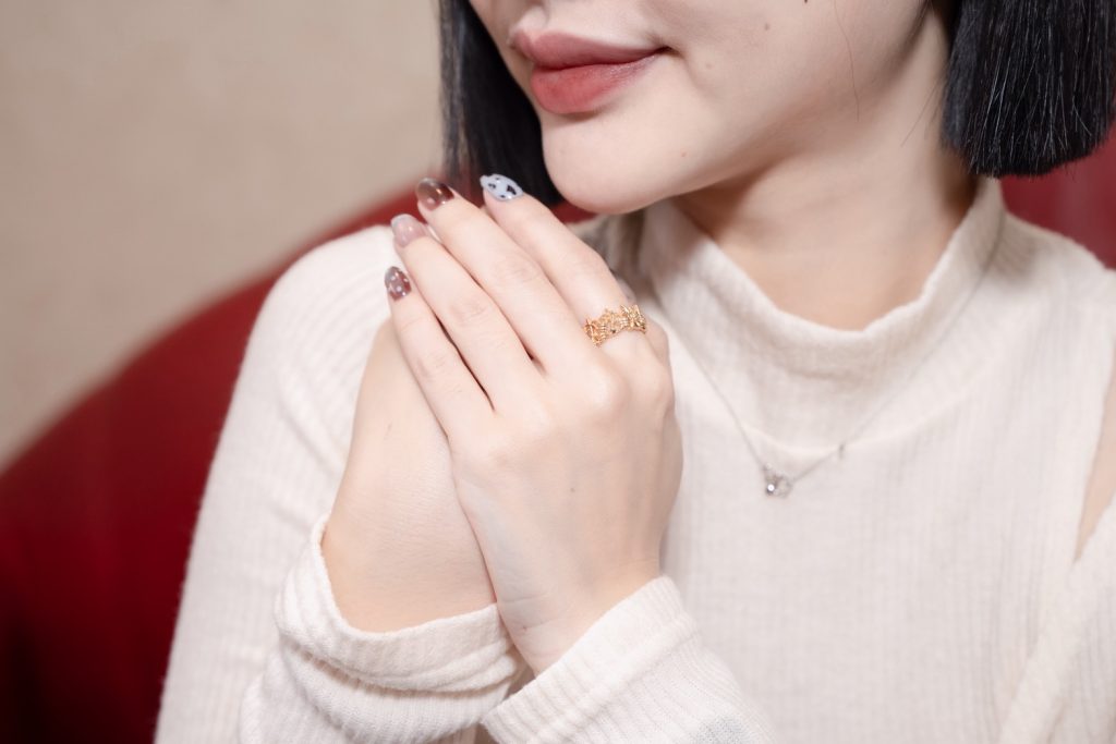 不同材質的調配也讓整體戒指設計更添溫暖細節,
