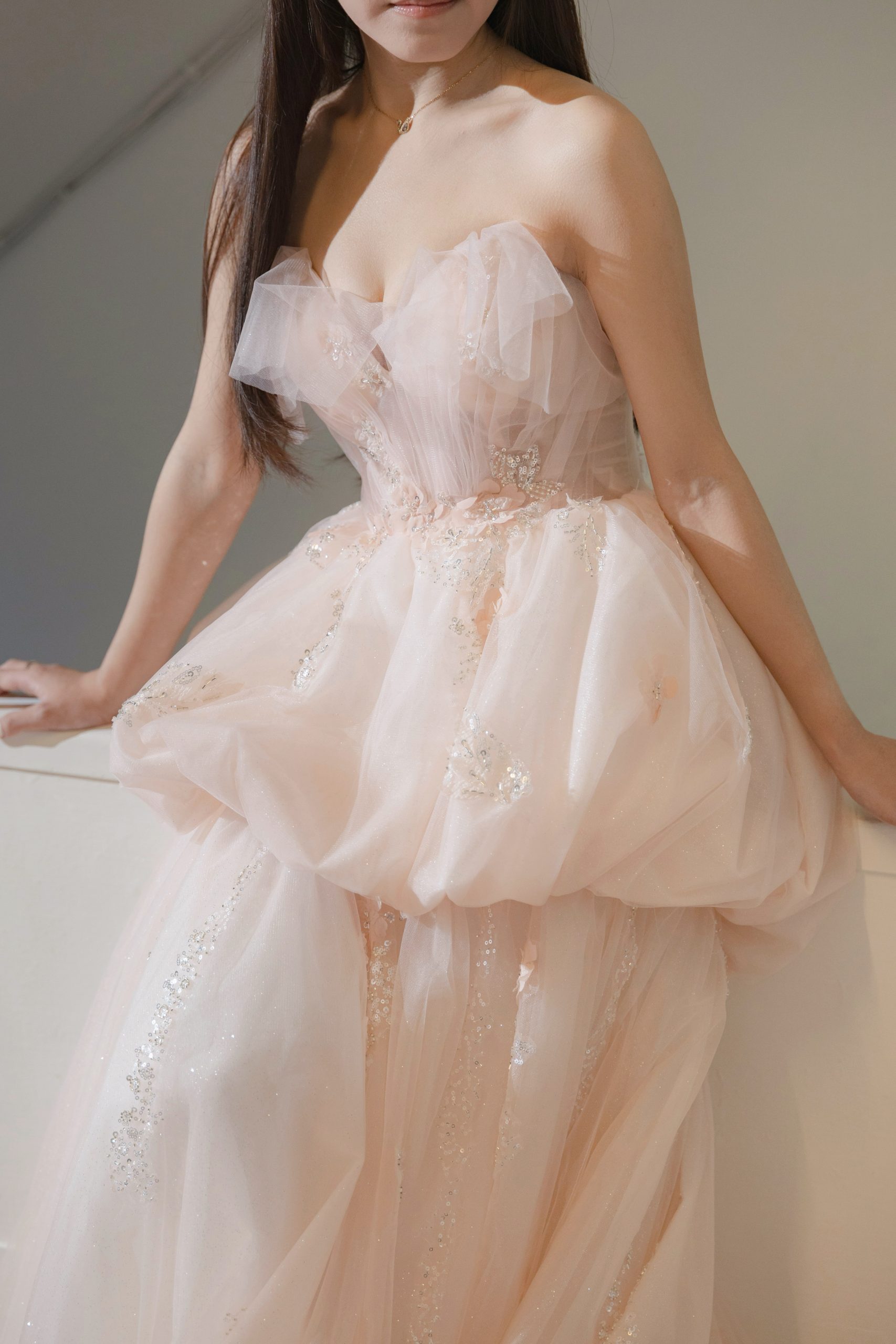 這件的亮點在於 霧粉刺繡+輕透裸紗,閃度很細緻、不浮誇。