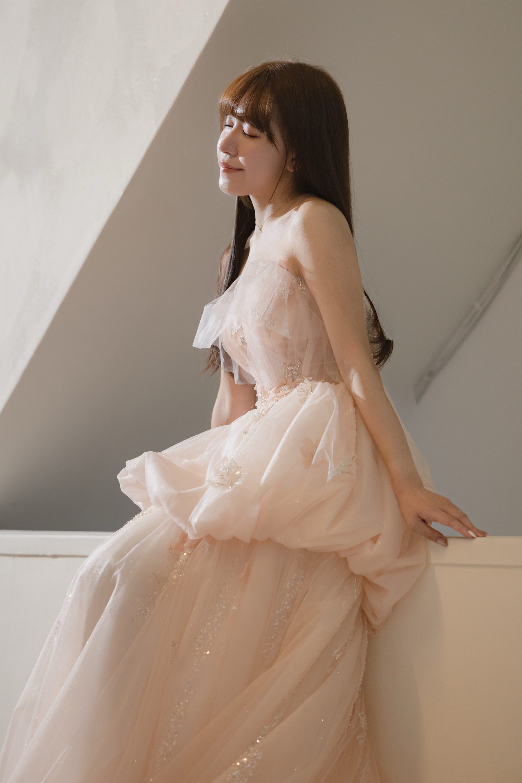 在光線下閃耀感很美,尤其靠窗拍照或白牆背景都能展現出這套禮服的層次與夢幻。
