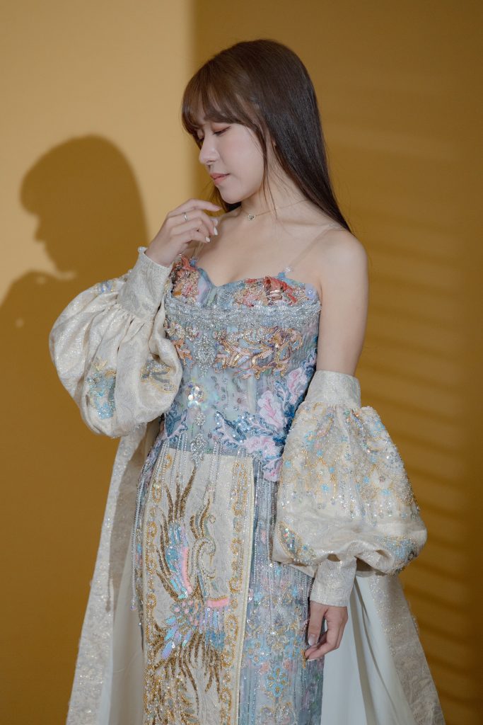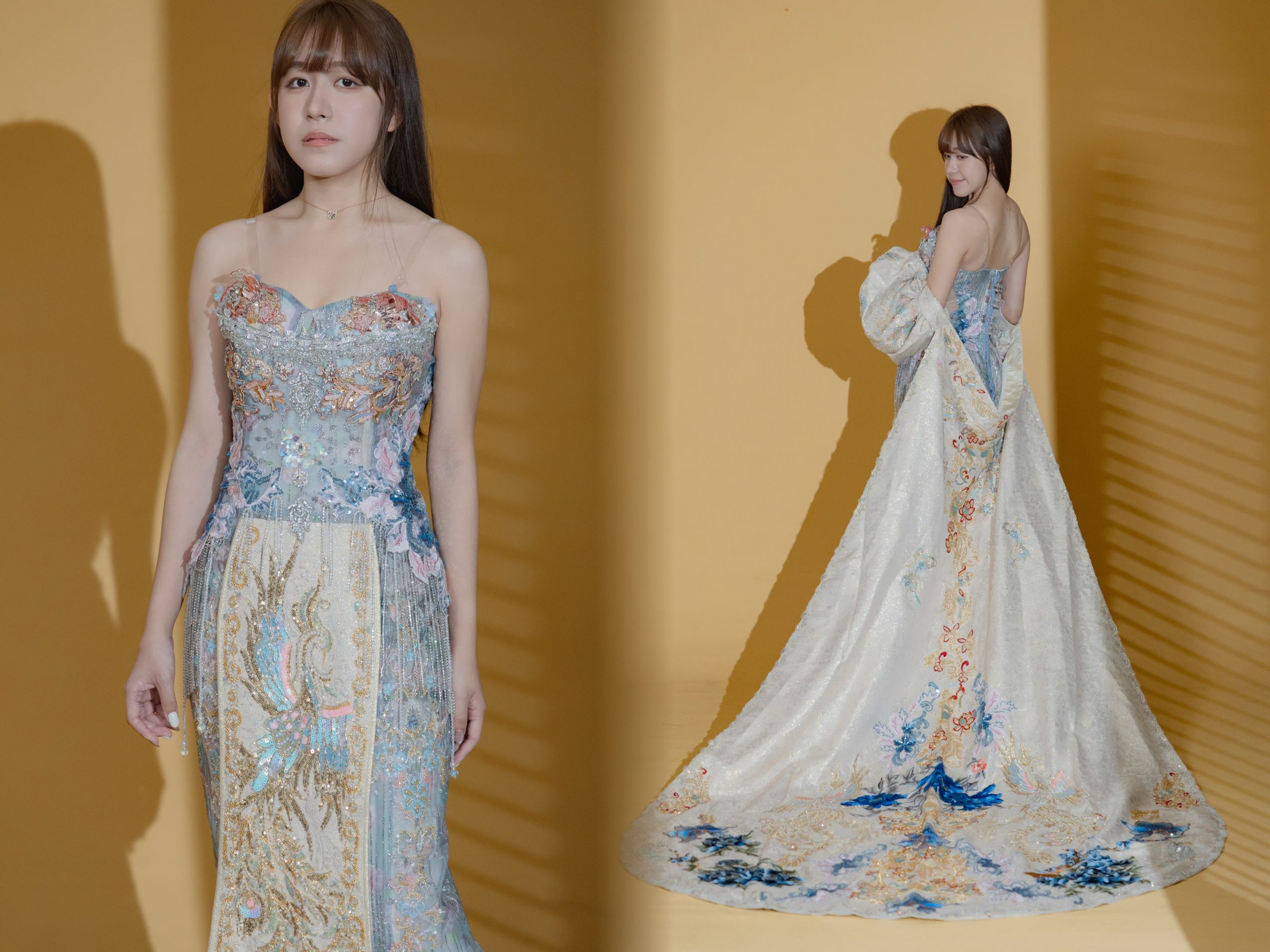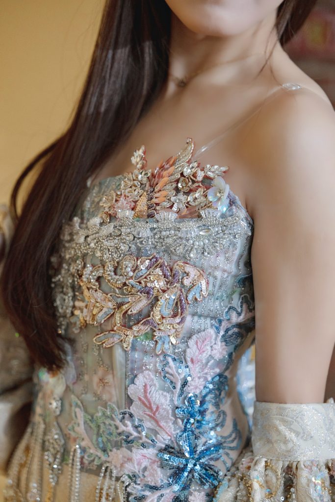 禮服以 彩色巴洛克刺繡+金絲線+珠鑽手工 製作,細節華麗又高級。