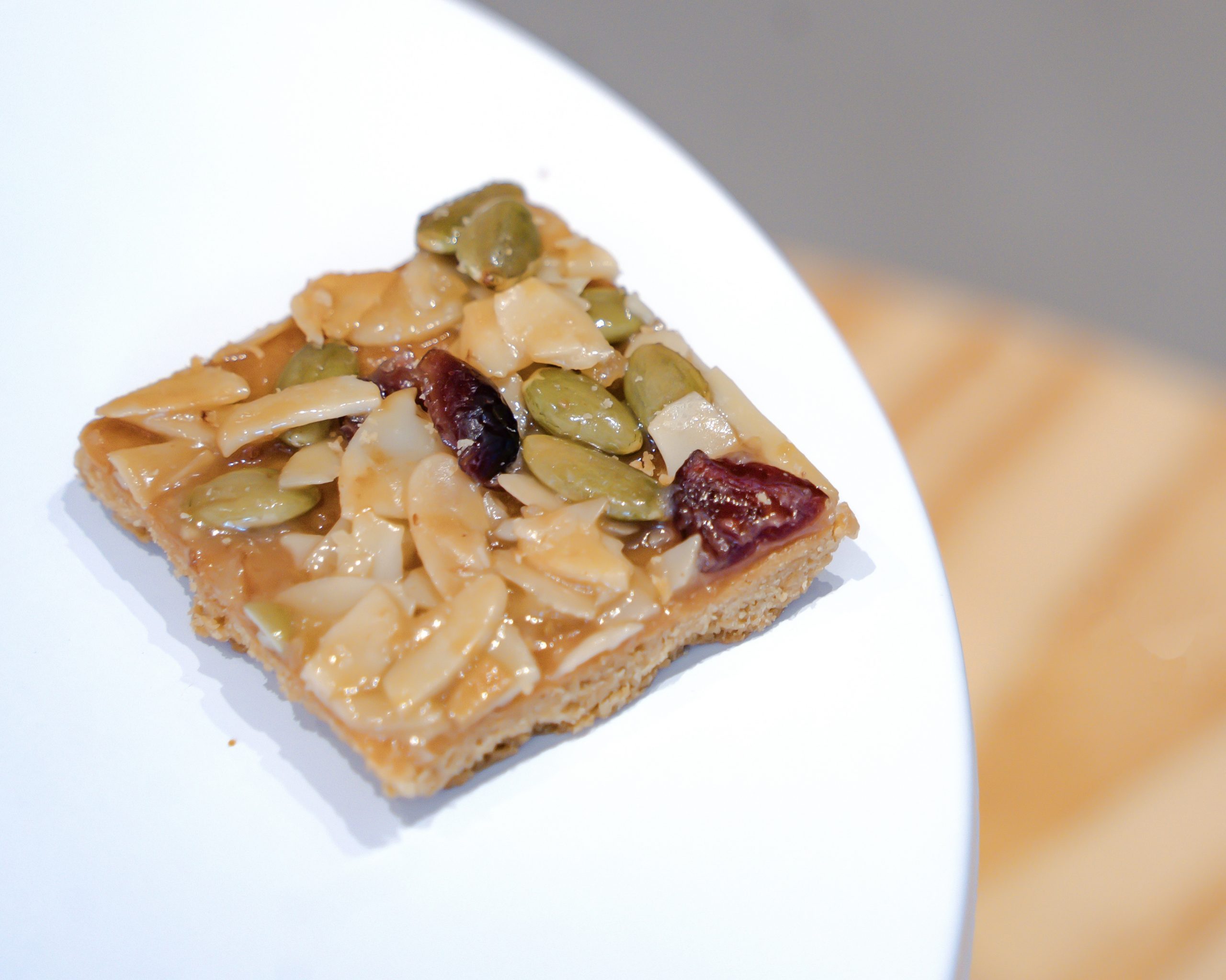 塔派餅皮鋪滿杏仁片、蔓越莓乾、南瓜籽