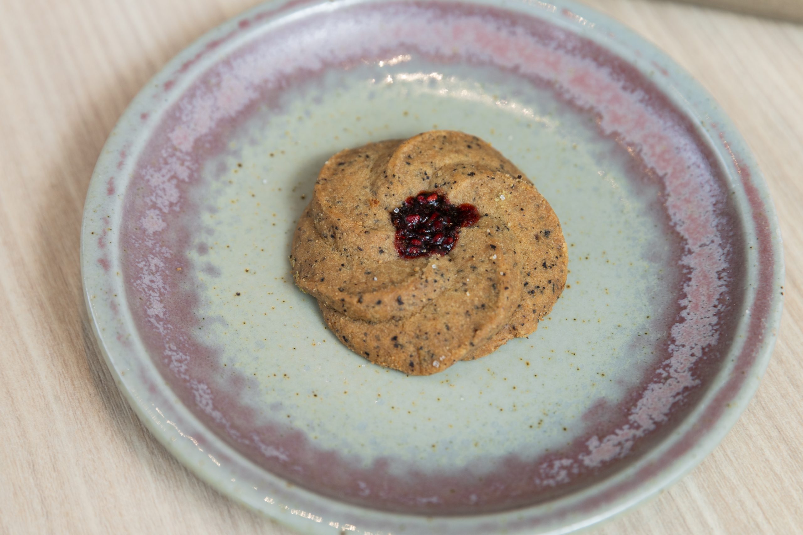 餅乾內部加入脆杏仁與莓果點綴,四邊裹著糖霜,帶出微酸果香與堅果酥脆~