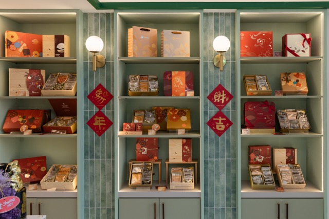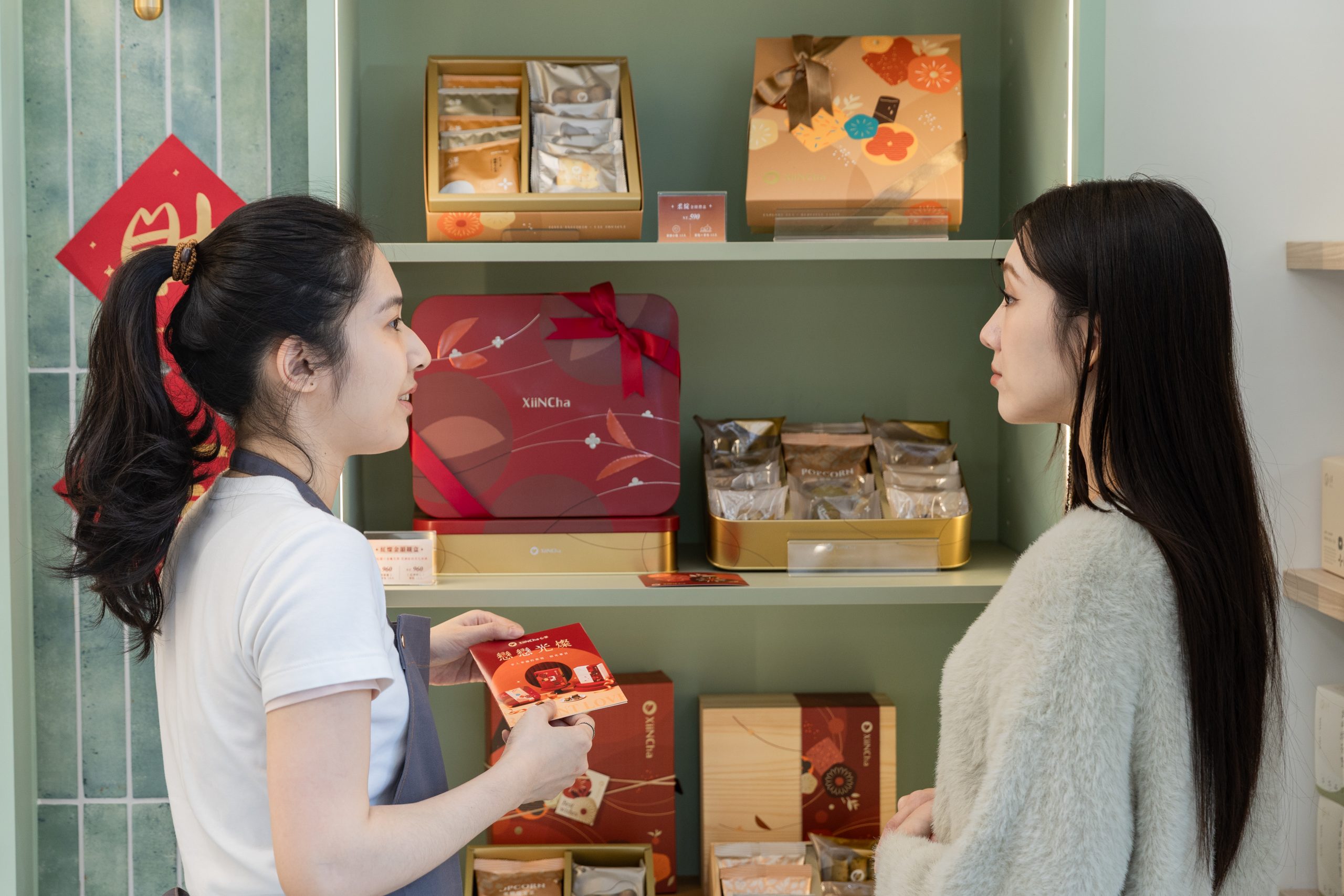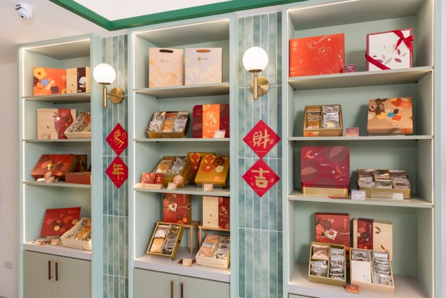牆面與層架上整齊陳列著茶葉與喜餅禮盒,