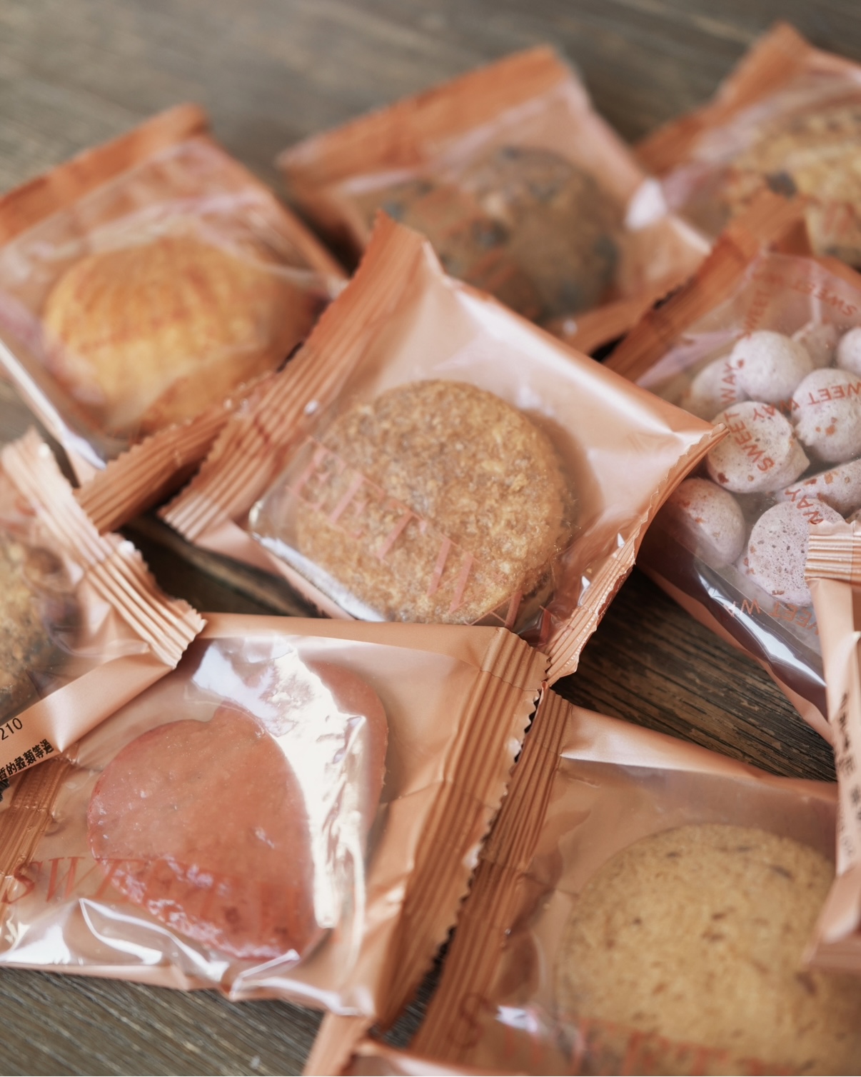 原味杏仁、巧克力杏仁、黑糖燕麥、義式脆餅、辣味起司、椰香、杏仁權杖、伯爵奶酥