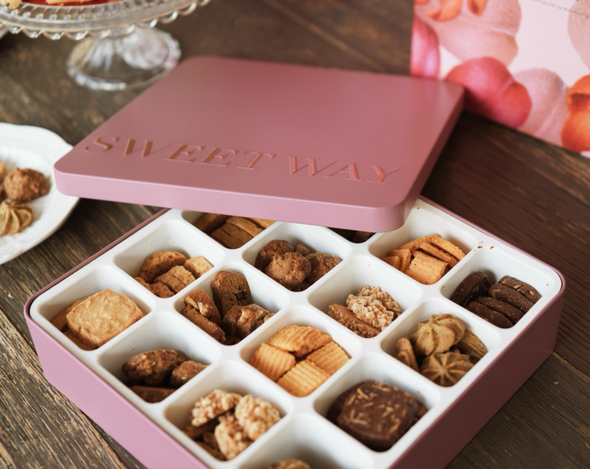 雙層禮盒設計,一層是中式大餅,一層是鐵盒裝的法式手工餅乾