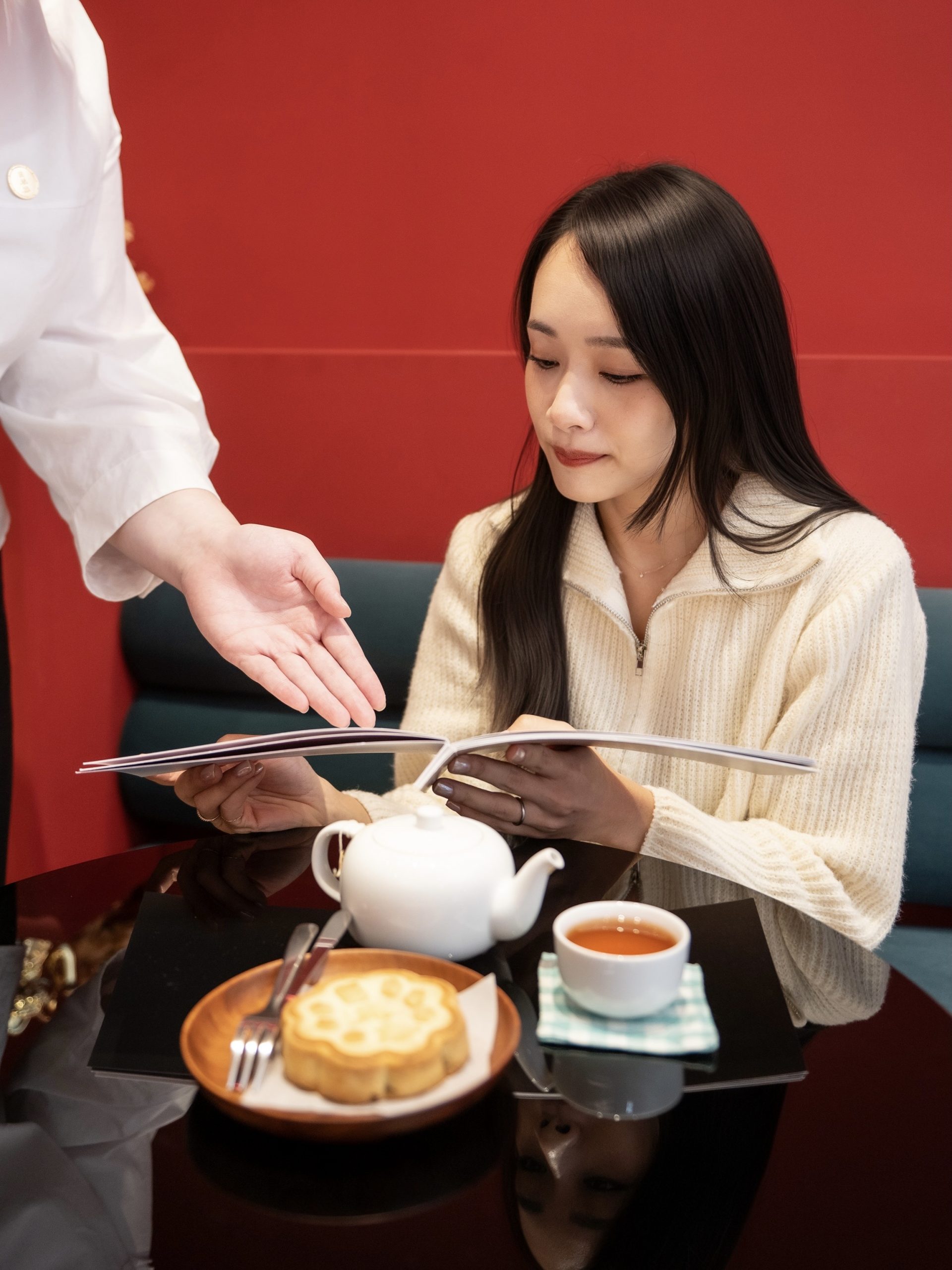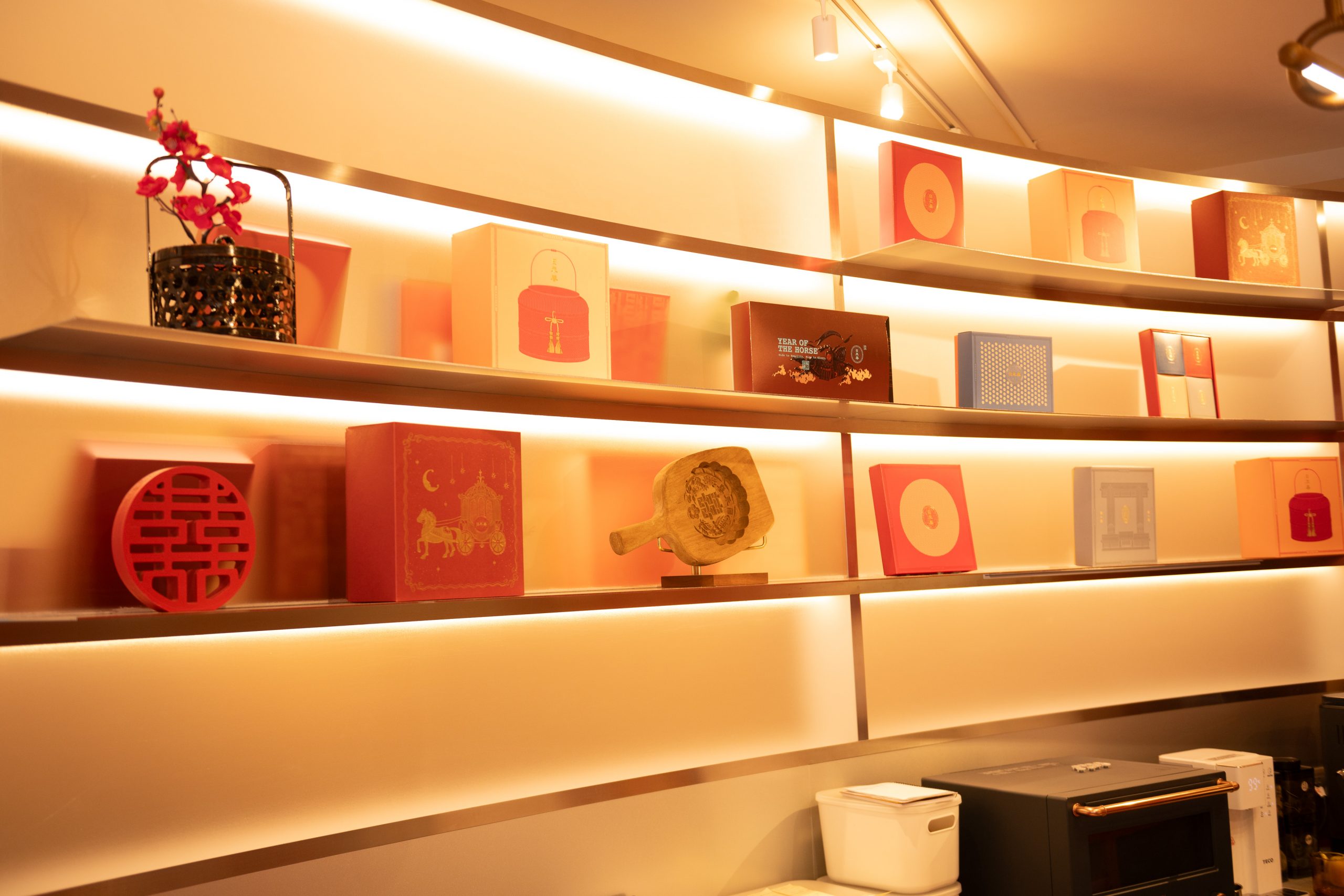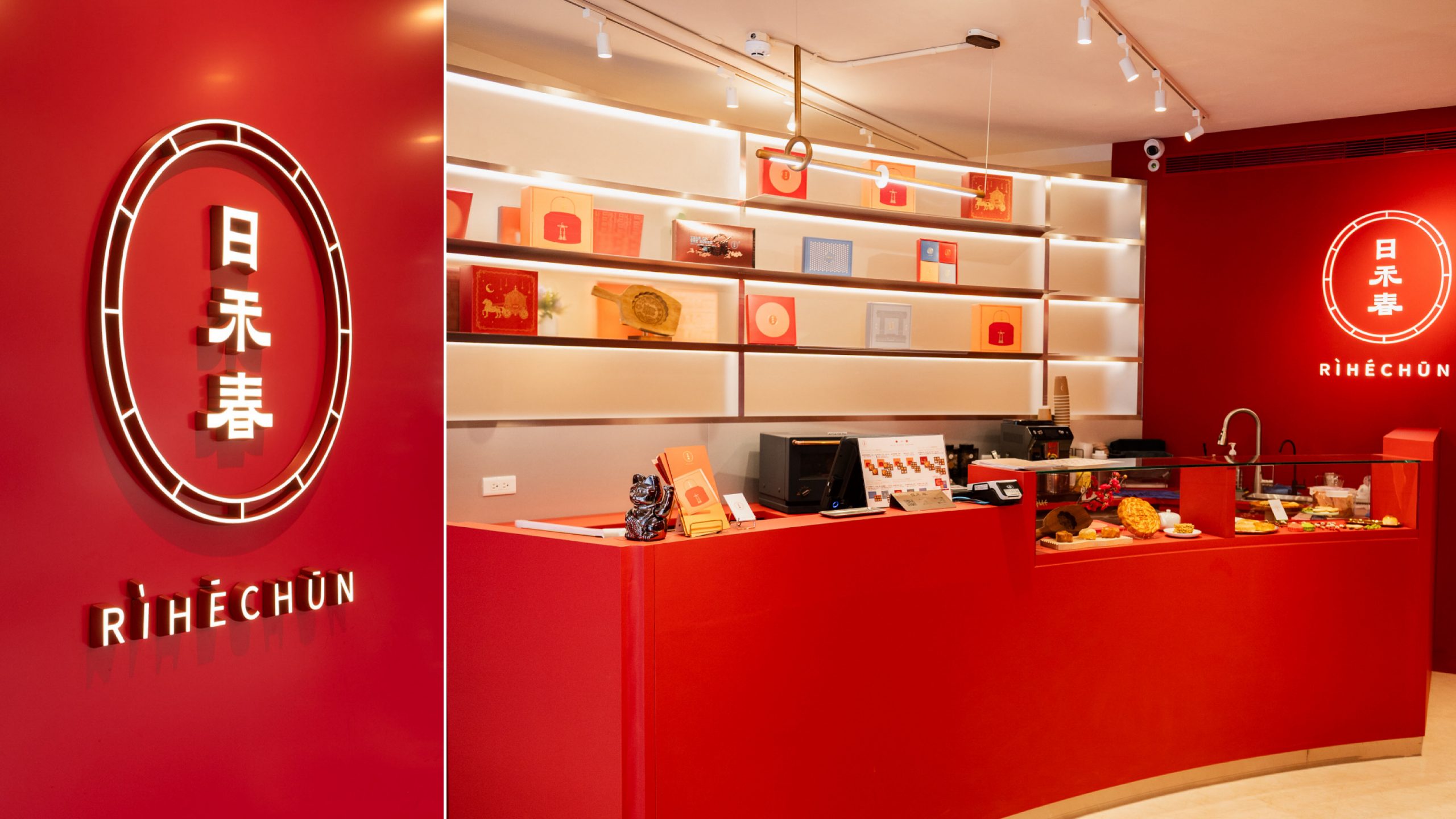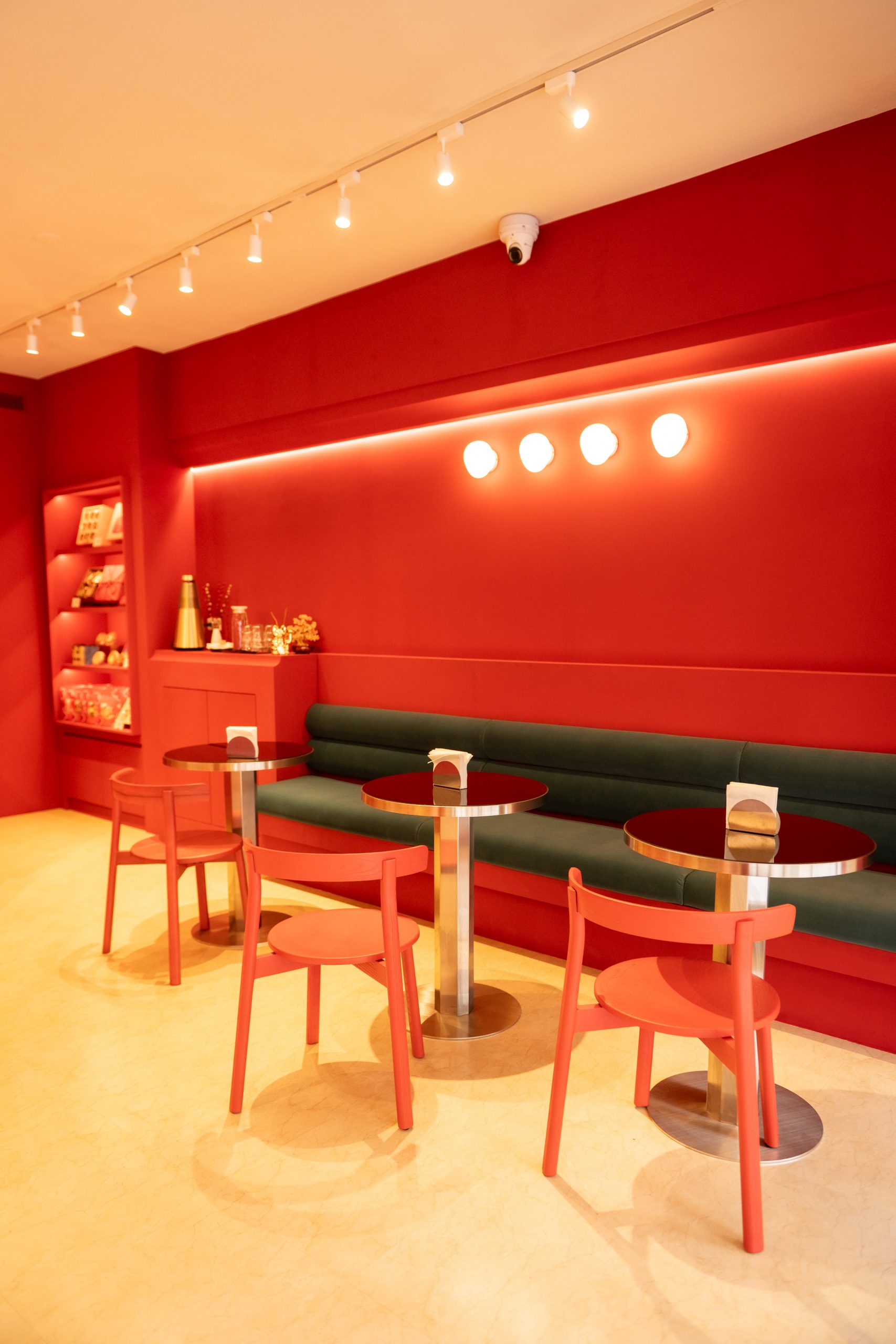 門市內區分成兩個區塊,以櫃檯為分隔,右手邊是下午茶品嚐區,大膽的紅色主色調,搭配暖黃光,一進門就能感受到滿滿的喜悅感。
