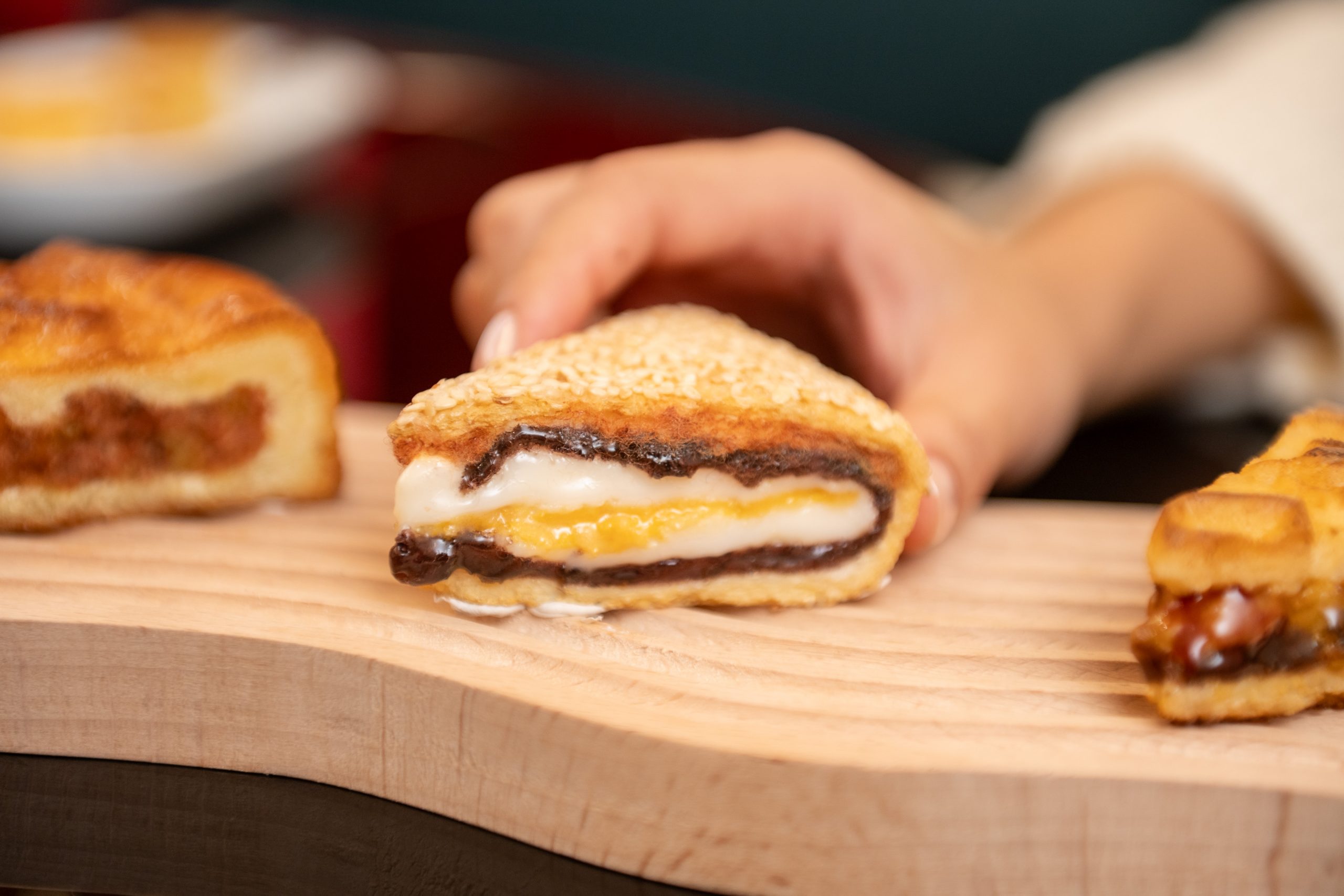 喜歡甜的大餅的人,千萬不可以錯過這一款,綿密的紅豆沙在口腔裡鋪陳,唇齒之間包覆著Q嫩的麻糬,肉鬆和鹹蛋黃的點綴讓整體口味大大升級,最畫龍點睛的部分是上方的白芝麻,每咀嚼一口,尾韻都有芝麻的香氣,一口接著一口停不下來~
