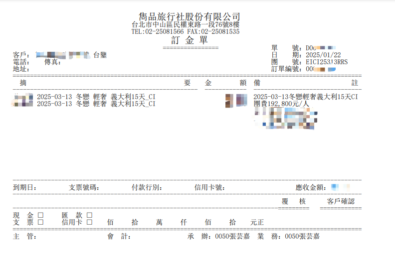 起初因為要飛這麼遠、金額也較大,僅僅透過線上進行讓人有些不安,但芸嘉很認真回答問題,幫我們找到答案,也安定了我的焦慮,目前付完訂金都很順利~~~(大石放下,可以先好好過個年😆)