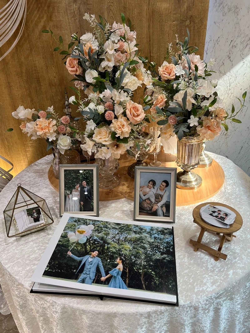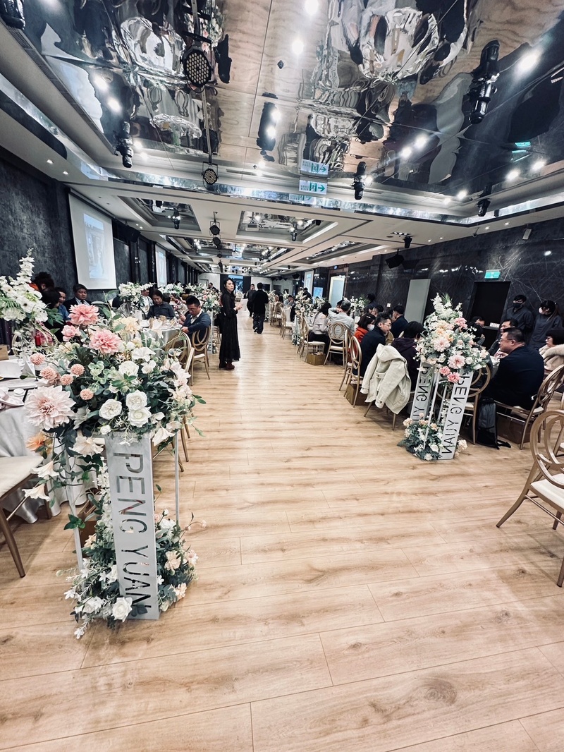 一開始在找餐廳的時候,第一家看的就是三重彭園,當時是由訂席的高碧玉服務我們,繞了一圈最後還是選擇這裡,時尚廳去年八月完成整修後,是以花草為主題的風格,唯一可惜的就是廳房狹長,沒辦法讓所有賓客接近舞臺,但是現場還是有其他投影幕讓賓客看到台上的狀況。