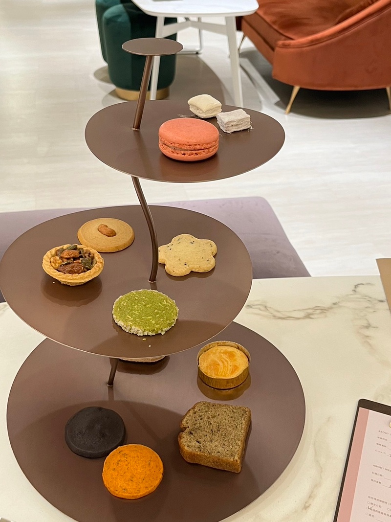 到達之後,接待人員請我們坐在沙發上,先填資料並準備了咖啡及紅茶讓我們可以配著點心,隨後試吃的甜點就上桌啦。今日試吃總共有12樣,包含了黑糖海鹽酥餅、香草抹茶沙布蕾、微酸愛情草甜餅、雙人棉花糖、布列塔尼酥餅、巧克力鹽之花、伯爵茶檸檬磅蛋糕、焦糖堅果塔、貝禮詩奶酒可可瑪德蓮、桂花鐵觀音達克瓦茲、覆盆子馬卡龍、匈牙利紅椒起司餅乾,吃的順序會依照口味從清淡到重口味,吃完大致的感想都不錯吃,但磅蛋糕覺得稍微乾了點,有幾樣讓人驚豔,像是貝禮詩奶酒可可瑪德蓮,門市人員還特別先烤一下再讓我們吃,剛從烤箱拿出來熱熱的吃,表皮脆脆的配上淡淡的酒香及可可香,以及巧克力鹽之花,濃郁的巧克力加上些許海鹽的調味,真的很好吃。有別於傳統大廠牌的喜餅,口味種類有變化,且味道富有層次,而且大部分的品項都不會很甜或油,