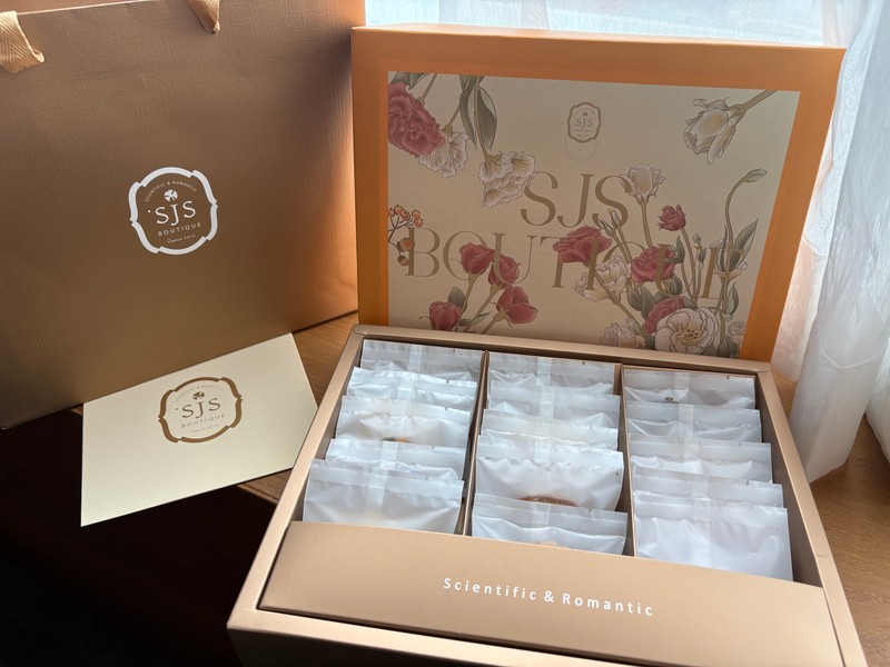 SJS重視原料及成分、也把每個品項做到位 雖然盒子跳脫了以往喜餅的設計 但我想給朋友沒有負擔又開心的去試 增加生活的樂趣