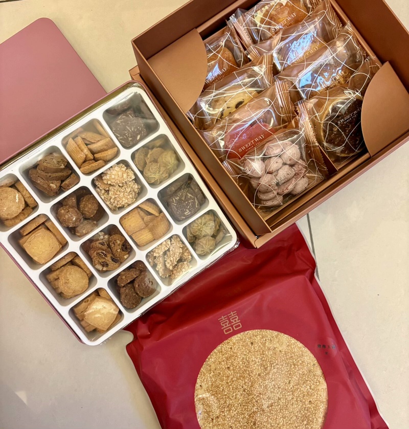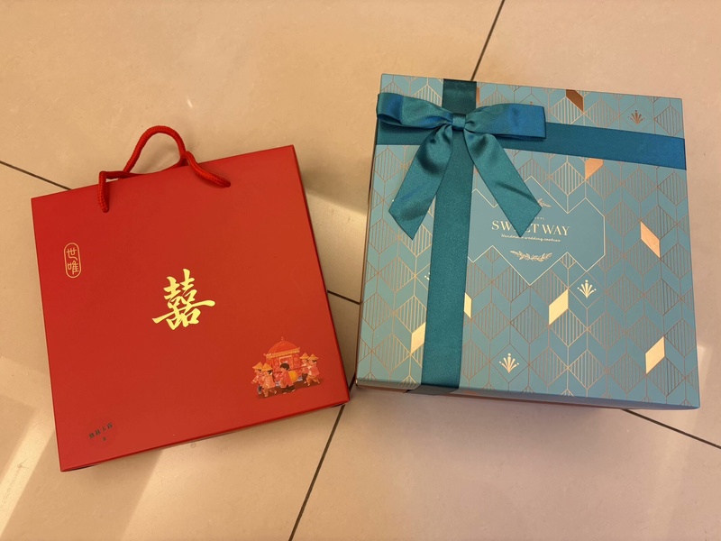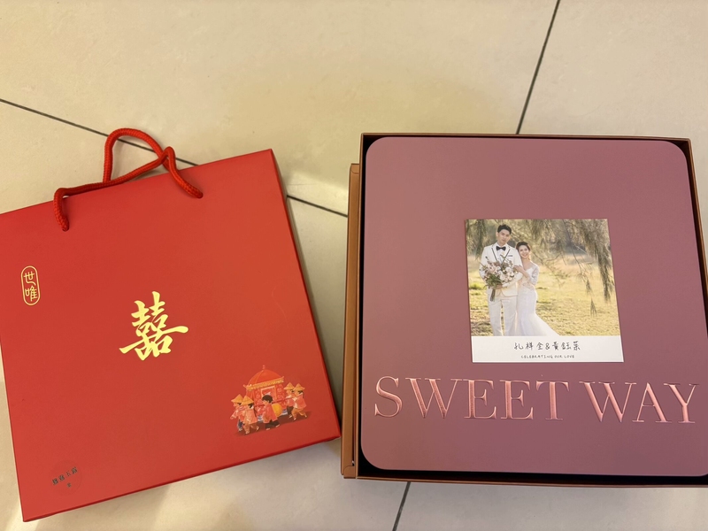 收到喜餅完全超出期待,必須給滿分五顆星!外包裝設計精緻大氣,外觀顏色個人非常喜歡,質感高級又不失喜慶,拿來送親友超有面子。送親友的過程發現不夠,還追加了呢。