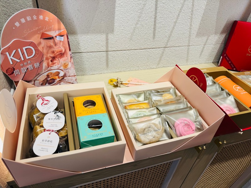 山木島是我們第一件試吃的店家,在還沒有計劃要結婚時就有看過這個品牌,當時對於品牌的印象就是包裝很簡約,是我喜歡的風格,山木島的餅乾外型上很吸眼球,通常會對於外面很漂亮很特別的餅乾的口味上不抱有太大的期待,但是其中有幾款讓我特別驚艷的是石虎餅乾、紅龜粿、花見餅乾,不僅外形好看吃起來也很好吃,還有一個很特別的茶罐小蛋糕也非常獨特,試吃完成後會請新人選擇組合模式及喜愛的餅乾糕點品項,並提供試算金額,及優惠條件,但因為有安排後面兩間試吃,所以就尚未決定,但是店員在過程中也不會給人很有壓力的感受就讓我們回去決定。