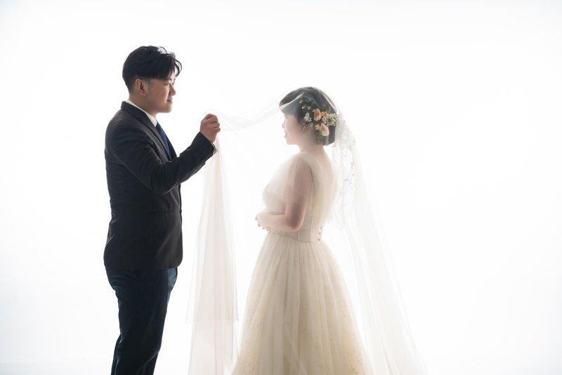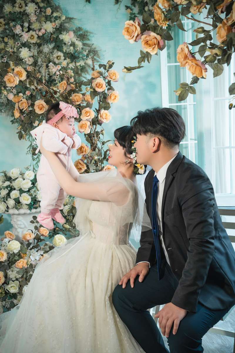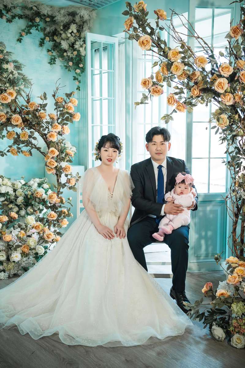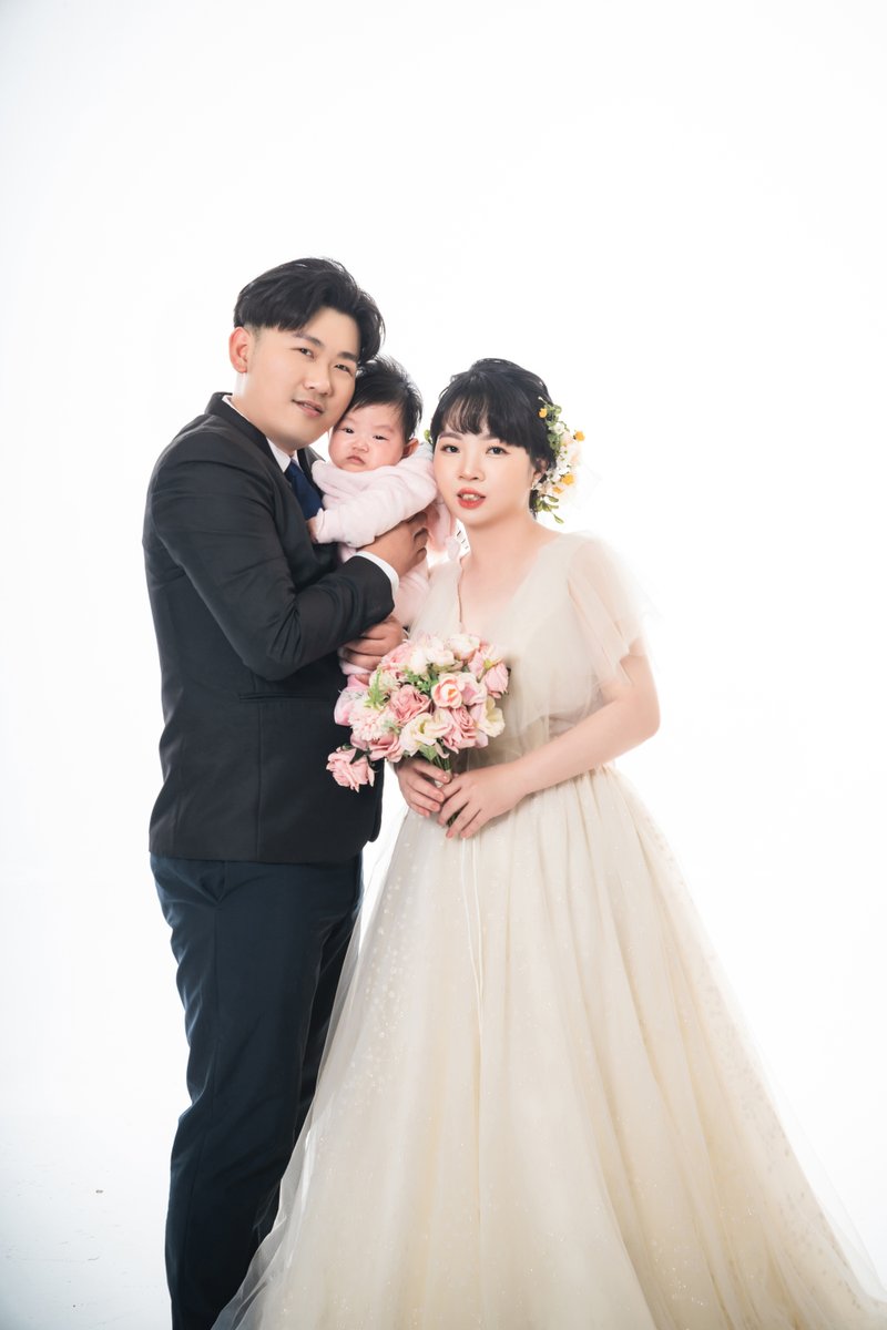 第一次與老公寶貝女兒一起拍攝婚紗全家福照,感受的體驗非常棒!從一開始的接洽及對談流程和化妝等拍攝過程,整個就是非常的詳細仔細跟專業,這次的妝容劃的非常精緻,劃完差點我快認不出自己了🥰整個就是很仙氣十足,老公的妝容也劃的相當細膩,很像霸道總裁😍,總之我們對首次的化妝體驗非常滿意;接下來就是拍攝囉~我們選擇的拍攝方式為攝影棚內(因為我們有小嫩嬰和自己本身為孕婦)