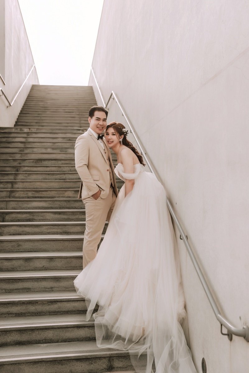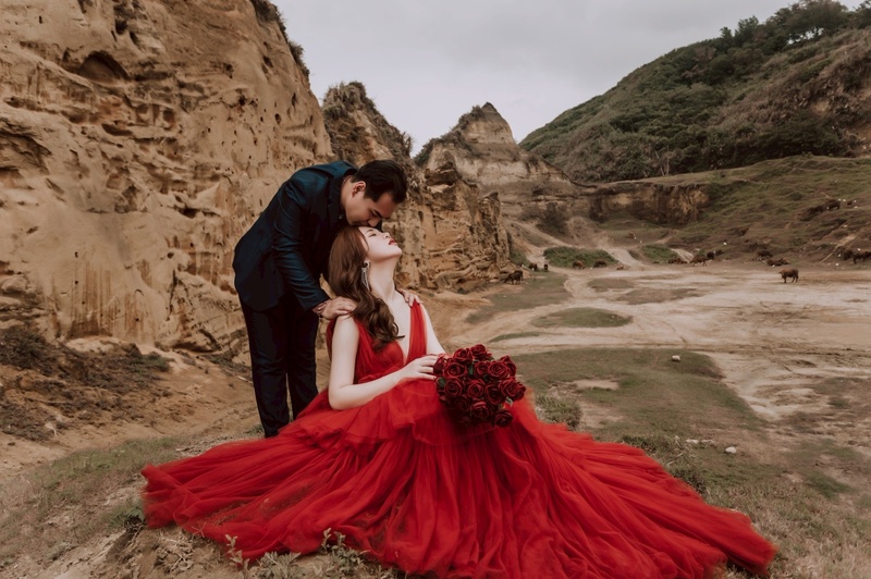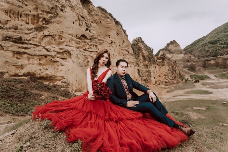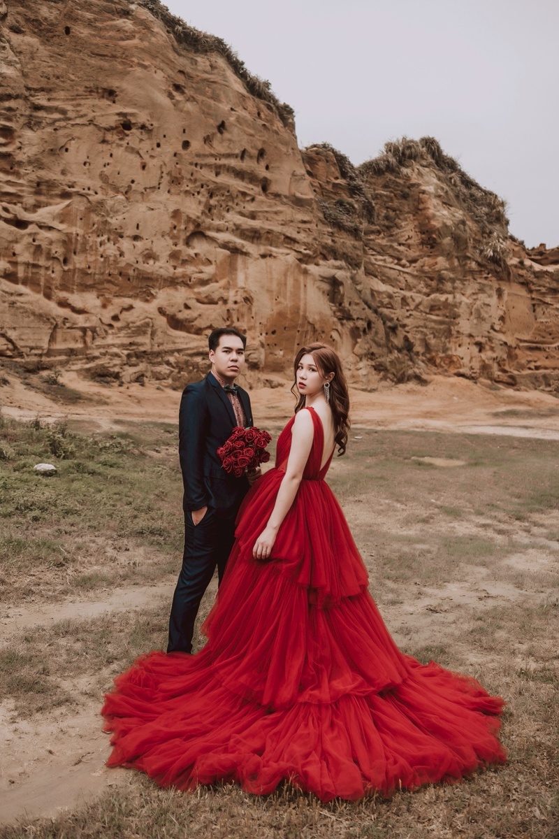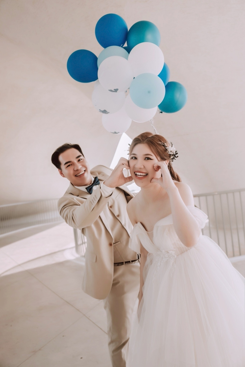 一見面就超級有禮貌的跟我們打招呼,介紹自己,接著就開始主動跟先生協調西裝怎麼搭我禮服、推薦哪條領結更時尚,甚至妝髮好後再拿出捧花讓我選,根本是穿搭顧問+美感顧問的合體!整個過程也超級貼心、細心,連我們自備的小道具都會幫我們分類整理好,拍攝時比我們記得還清楚!拍攝的時候也會注意到每一個小細節,幫忙調整裙襬、西裝、拿東西,甚至還主動幫我噴防曬XD 有他在是真的超級無敵放心,真的可以把自己當明星的感覺!