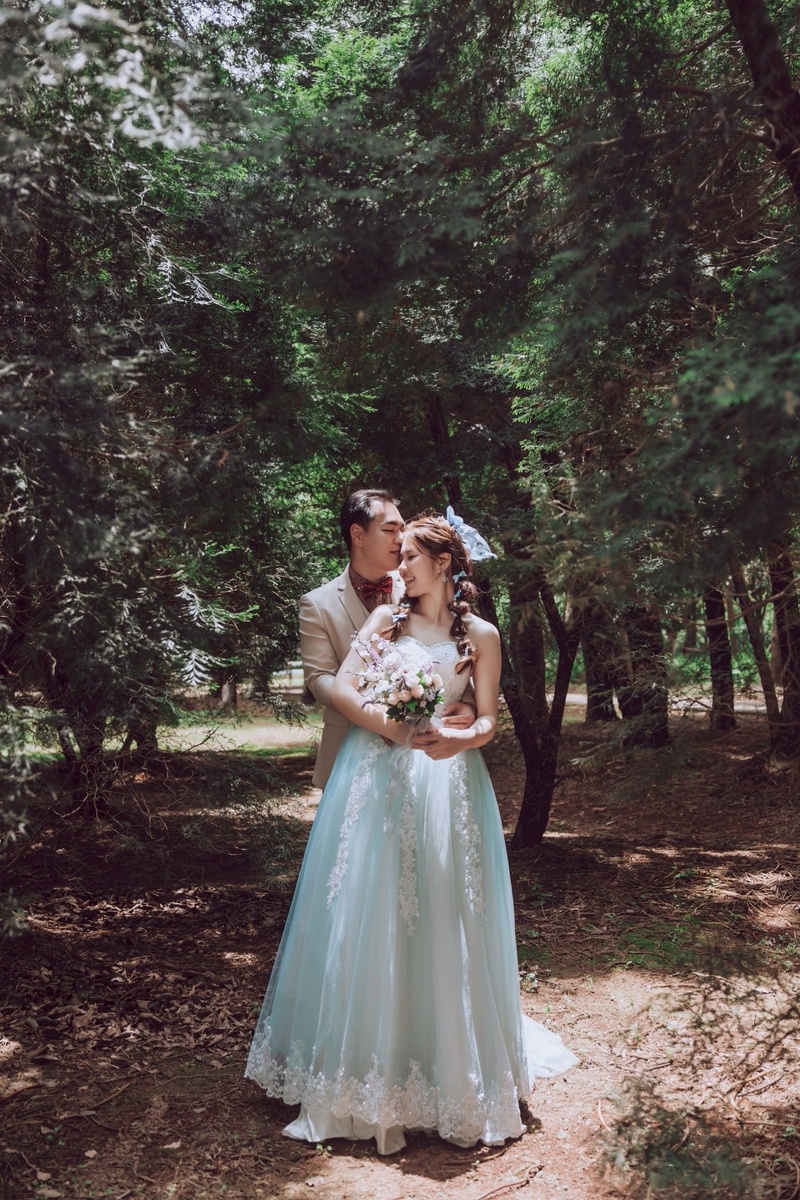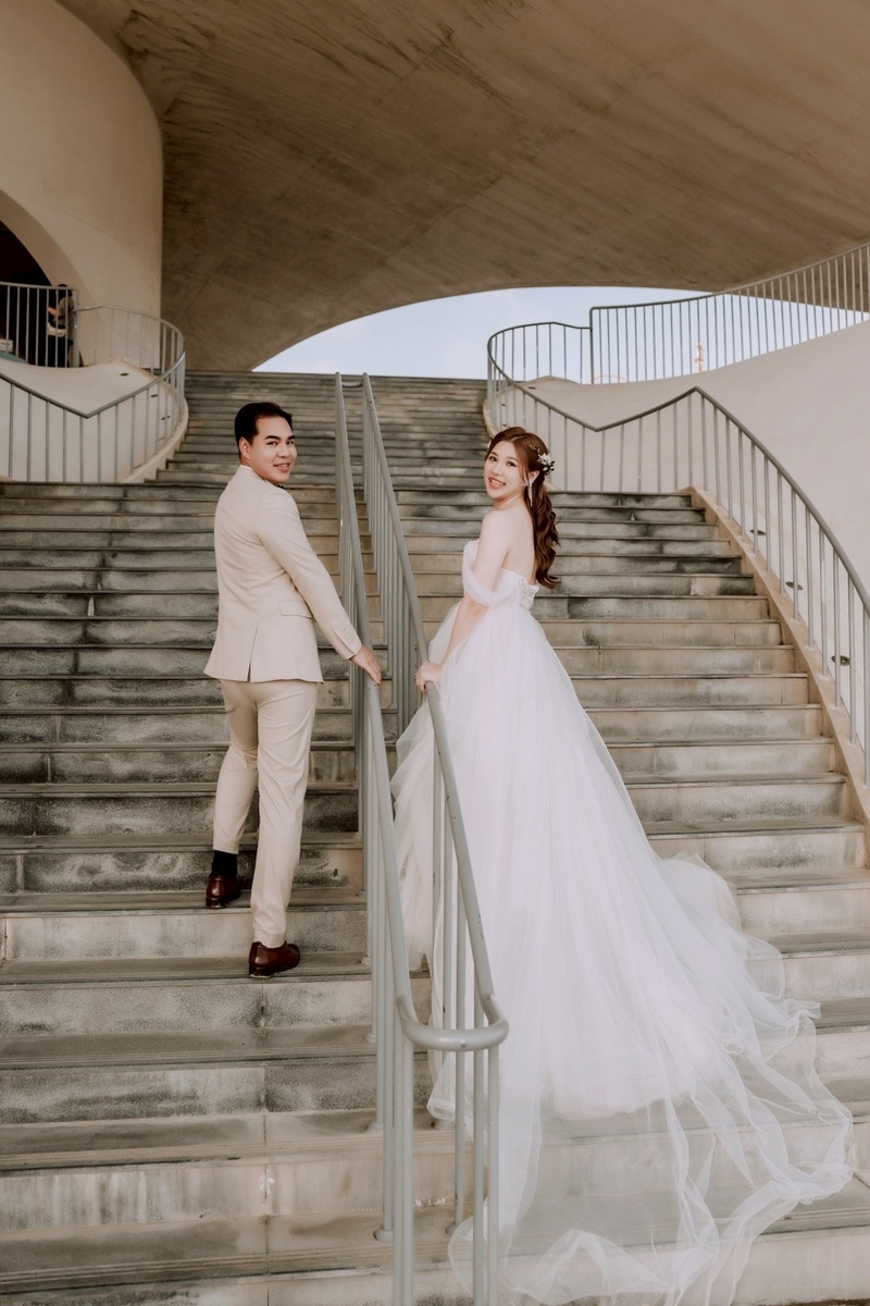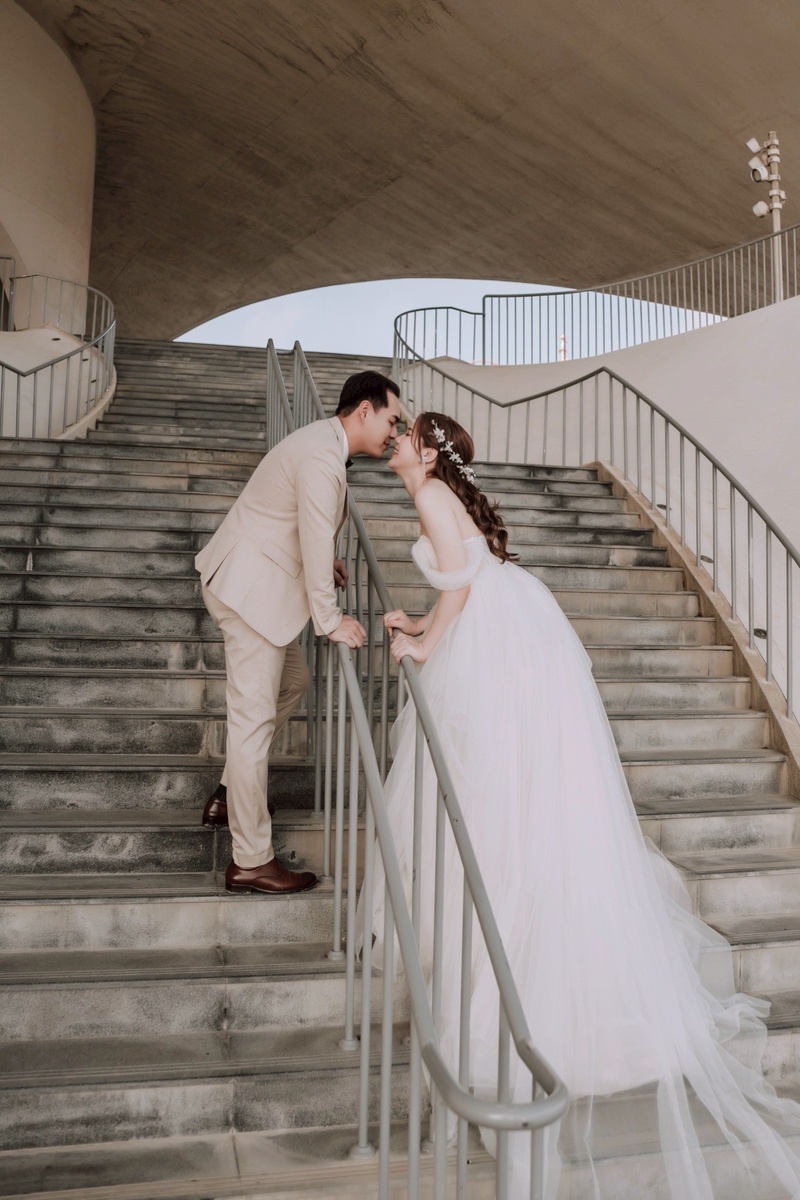 一見面就超級有禮貌的跟我們打招呼,介紹自己,接著就開始主動跟先生協調西裝怎麼搭我禮服、推薦哪條領結更時尚,甚至妝髮好後再拿出捧花讓我選,根本是穿搭顧問+美感顧問的合體!整個過程也超級貼心、細心,連我們自備的小道具都會幫我們分類整理好,拍攝時比我們記得還清楚!拍攝的時候也會注意到每一個小細節,幫忙調整裙襬、西裝、拿東西,甚至還主動幫我噴防曬XD 有他在是真的超級無敵放心,真的可以把自己當明星的感覺!