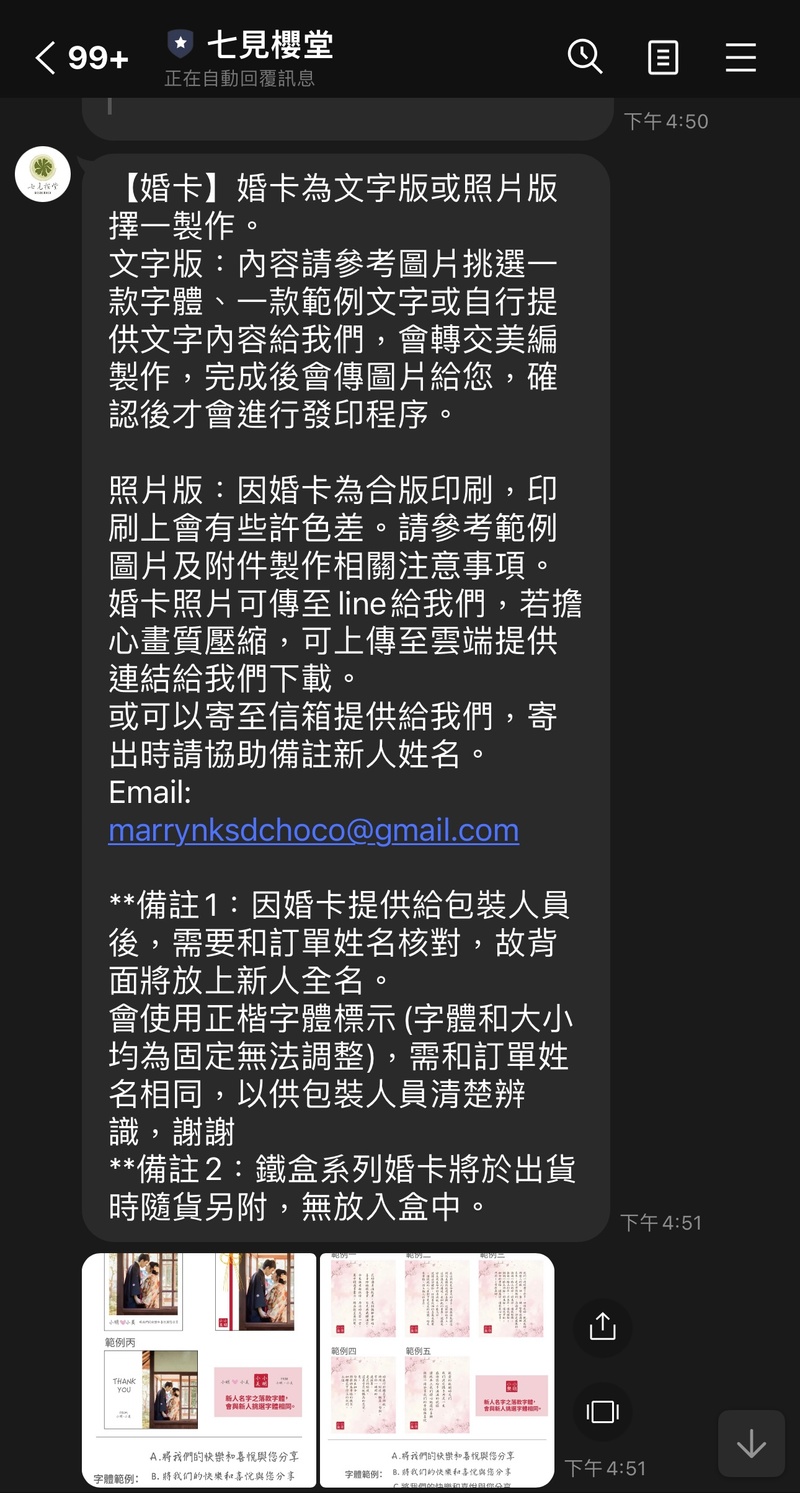 之前有收過親友結婚送的日式喜餅,覺得很不錯,所以自己結婚時,也想以日式風呂敷包布喜餅為主,因為日式喜餅店家不多,且還要有漂亮有特色的包布實在少之又少,所以在找喜餅品牌的時候,在網路上被七見的包布禮盒吸引,就再也容不下其他品牌了🤣,但由於我是台中人,安排專程上去一趟台北門市試吃又覺得舟車勞頓,過程中一直期盼七見可以參與台中的婚展,也遲遲沒看到參與婚展的資訊;每隔一段時間就電話或訊息跟店家確認,不過門市人員都不厭其煩的回答我的問題,後來朋友非常推薦,讓我不試吃就決定下訂了,訂購的訊息過程,門市人員對於我提出的問題,都提供非常詳細的說明與解答,除了訂購喜餅,我也加訂了其他品項,推薦給大家☺️