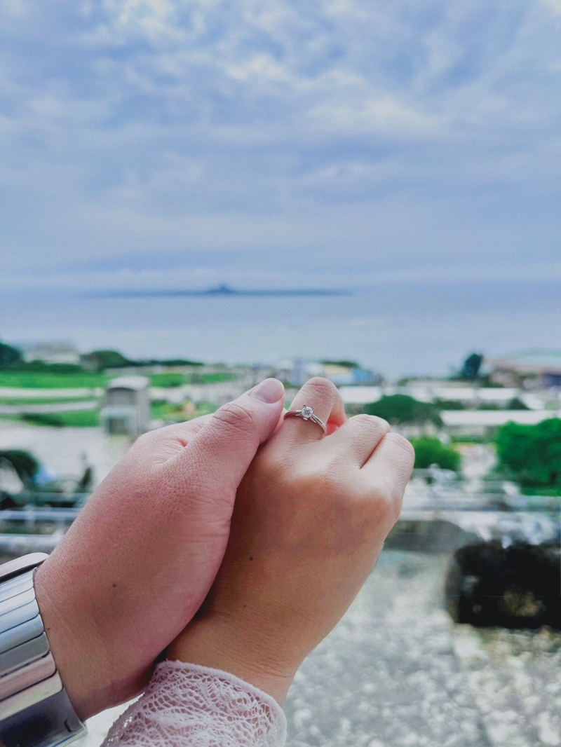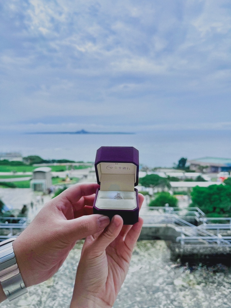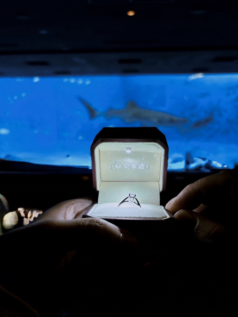 知道妳怕多人的關注所以我沒有單膝跪下跟妳求婚,而是傳LINE的訴說自己想對妳所說的話,並拿出我拿出了在京華鑽石精挑細選的求婚戒指——那顆SID頂級車工的鑽石,在水族館柔和的光影中閃耀得特別炫亮動人。它不僅象徵著閃耀的愛,也代表我對妳堅定不催的承諾。在鯨鯊的見證下妳願意嫁給我嗎?看著妳眼眶泛紅的點點頭。