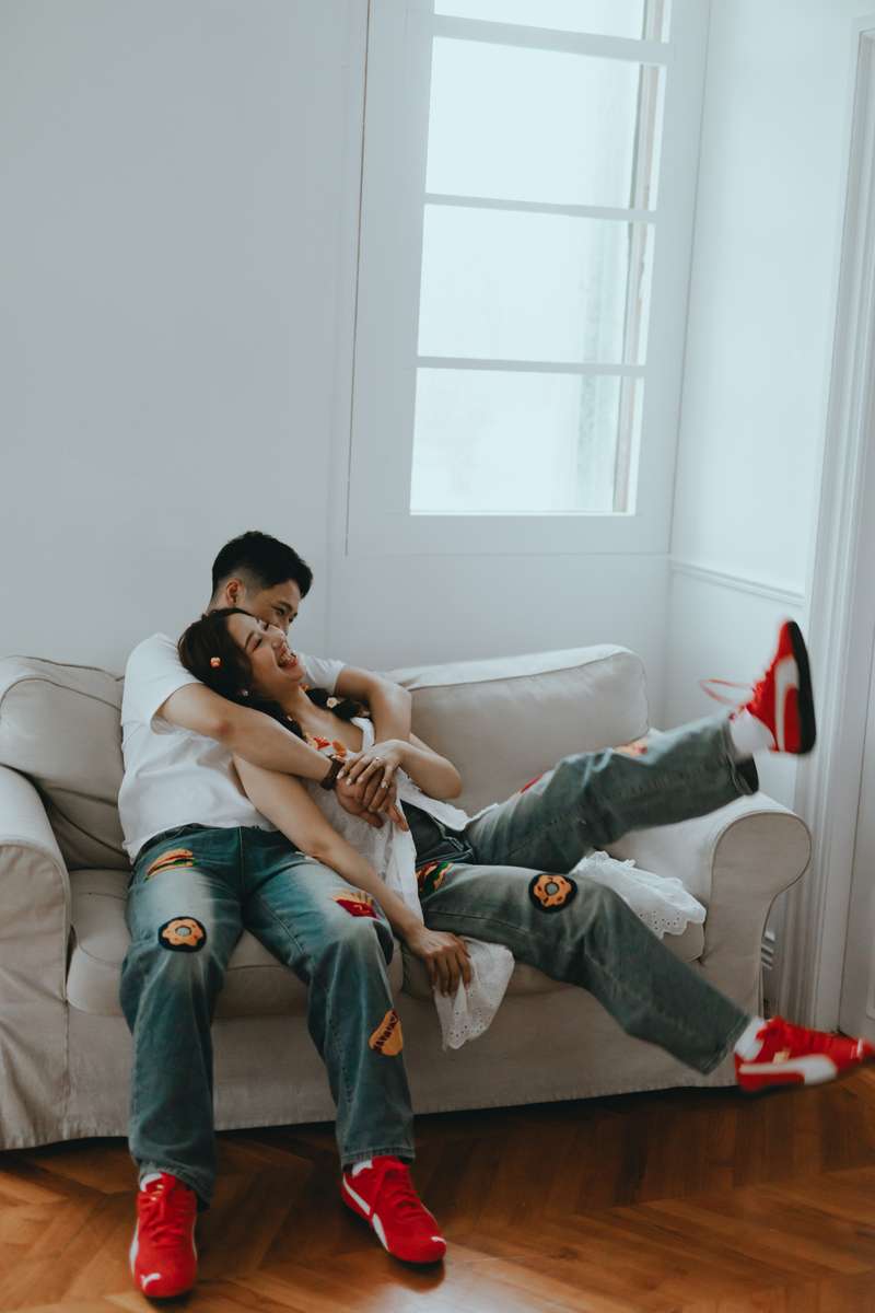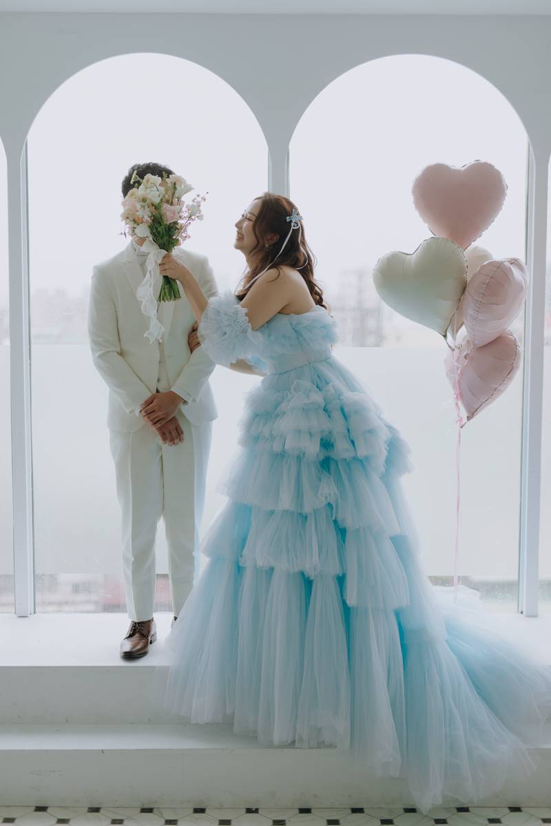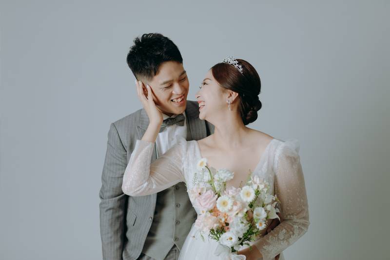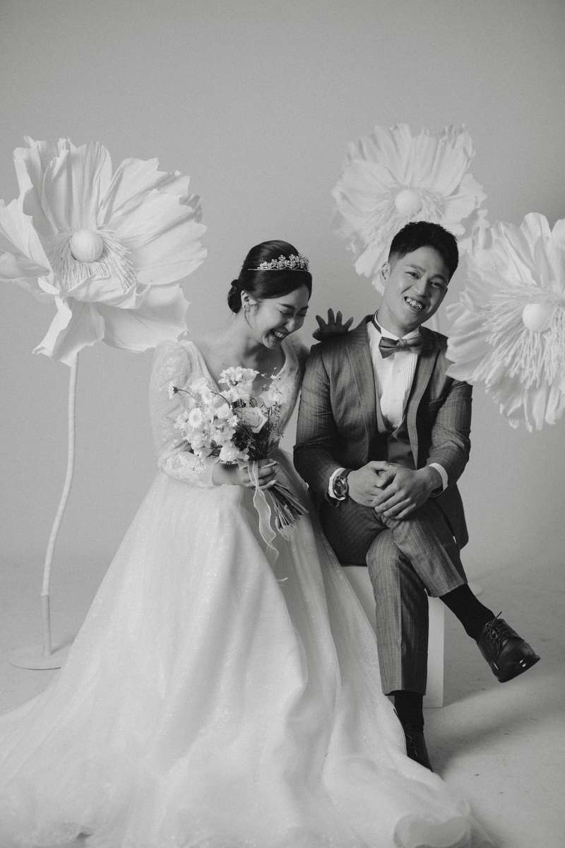 到了拍攝當天,雖然天公不作美,老師們也有建議改期,但因為老公和我的時間比較難安排,所以我們就照原定計畫進行,原本外拍的場地不能使用,柯柯老師也很快速的推薦我們適合的攝影棚,轉換成室內拍照,最後拍出來的效果我自己也很喜歡!