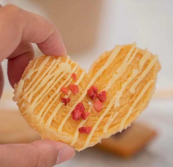 愛心的造形圖案,餅乾上頭使用酸甜的草莓顆粒,吃起來口感酥脆可口。