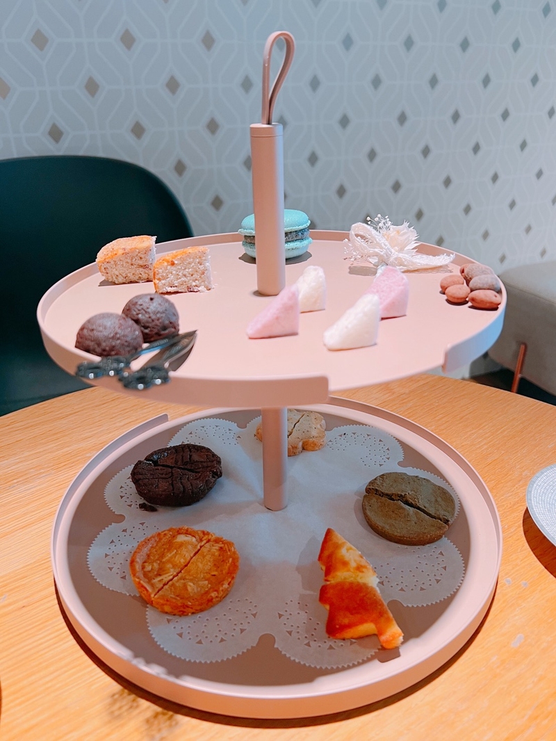 內容物有鹹有甜(法式水果棉花糖、巧克力鹽之花馬卡龍、黑芝麻白巧克力馬卡龍、墨西哥紅椒杏仁餅、ROCK巧克力豆、綠茶玫瑰餅乾、咖哩米香餅乾、星型布朗尼蛋糕、愛情樹瑪德蓮蛋糕、玫瑰柑橘蛋糕、杏仁果香草餅×2、巧克力蔓越莓餅乾×2)。