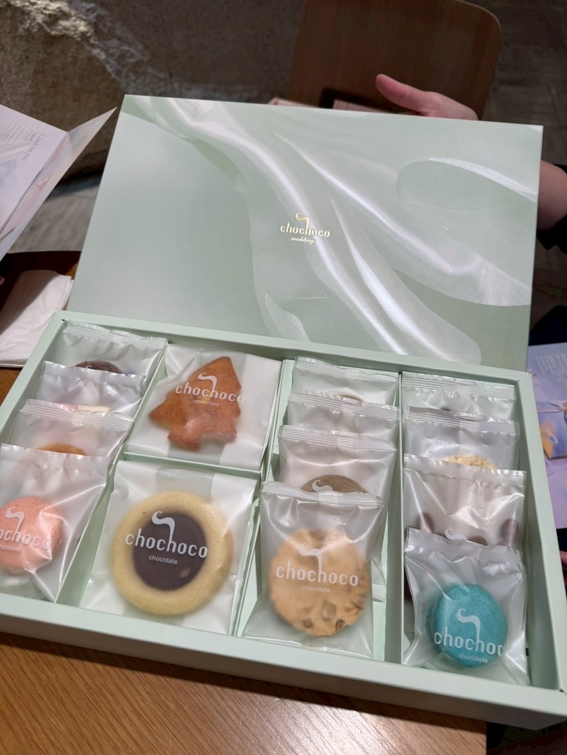 某次買巧克力時發現他們也有賣喜餅,當時就很有興趣。一確定婚期後,我就馬上預約試吃,接待人員非常親切,事前耐心說明流程與價位,讓人感覺很舒服😝😝試吃當天我帶了媽媽和嫂嫂一起去,服務人員不只照顧我,也很關心家人的感受,詳細介紹每一款餅乾。