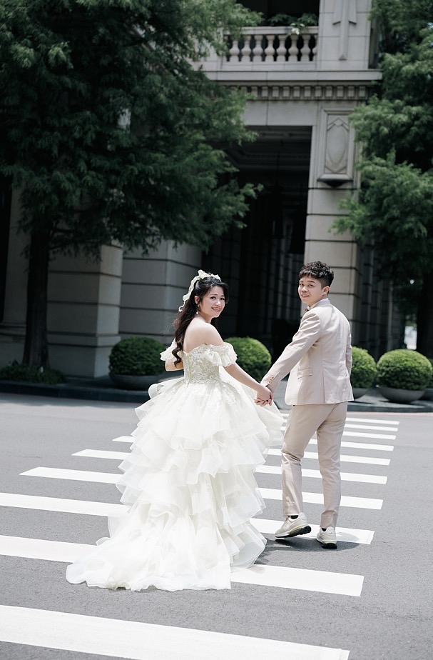 拍攝婚紗的當天,感謝早起的造型師:麗雲幫我設計妝髮,感謝造型師的巧手把我跟我老公當天變得美又帥👍我第一次外拍其實當天我超級的緊張,我這個人想很多,不太會擺姿勢不太會控制表情,感謝我們的攝影師:Eason 很有想法的帶領著我們嘗試不同感覺的Pose ,有他在覺得很安心🤣 也要感謝燈光師:Daniel 辛苦他隨時在我們旁邊站著幫我們打光。