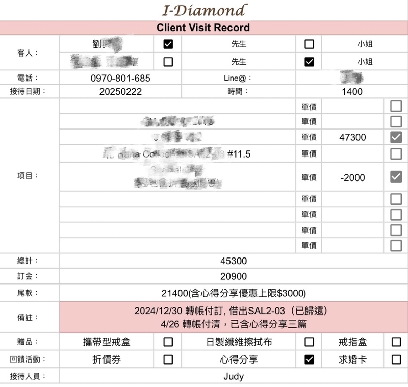 這一刻讓我更深刻地感受到,這枚戒指已經不只是一件首飾,而是我們愛情故事的一部分。Judy 的細心服務,讓這次回店的體驗就像求婚的延續,充滿了甜蜜與默契。
