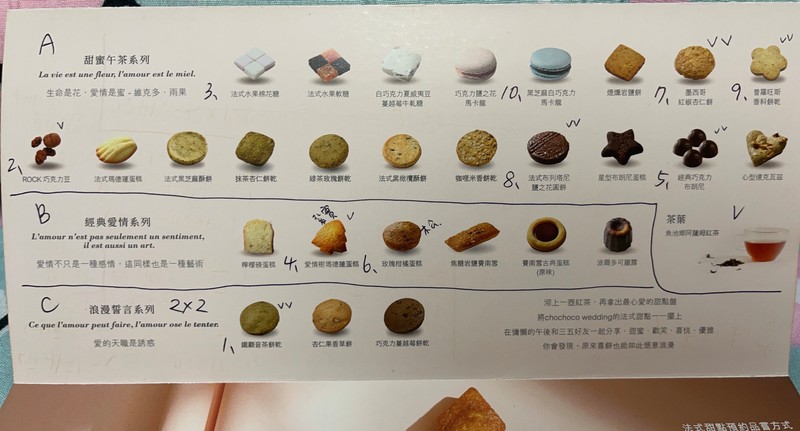 每一間喜餅都各有優缺點,每個人的口味喜好也不太一樣,但是新娘我本人對於結婚這件事有一個自己的堅持‘我的婚禮就想要挑我喜歡的’,也很開心我先生的口味及喜好都和我相近(果然是天造地設的啊哈哈),唯獨喜餅需要挑自己喜歡賓客也喜歡的(因為新娘不能吃自己的喜餅嗚嗚)。本來帶著媽媽走進chochoco時沒有抱太大的希望,因為曾經也有任職過同樣是法式喜餅的相關產業,我覺得對於我媽來說會太過甜膩,更別說其他長輩了,好了,進入正題...