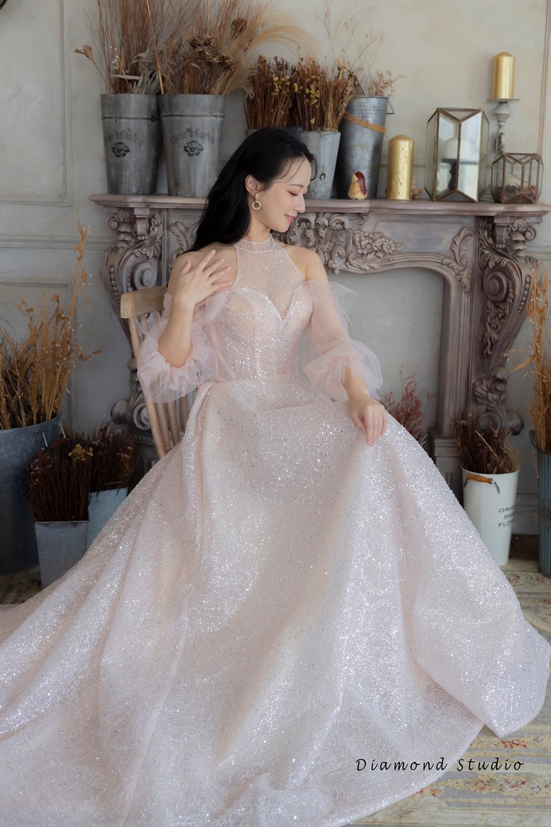 💗【星語晨曦・粉色亮紗削肩A字裙】 宛若拂曉晨光灑落,浪漫粉色融合滿版亮紗,隨步伐間綻放璀璨光芒。 削肩剪裁勾勒優雅線條,可拆式薄紗袖設計在仙氣與俏麗之間自由切換,讓新娘展現多層次的迷人姿態。 【設計亮點】 ・粉色基調結合細緻亮紗,營造浪漫而閃耀的氛圍 ・削肩剪裁,修飾頸肩線條,展現優雅氣質 ・可拆式薄紗袖,隨場合轉換造型風格 ・A字裙襬流暢自然,修飾身形比例,散發公主般的華麗感