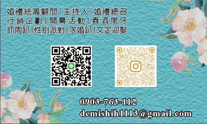💒 婚禮主持服務 🔸 純宴客主持 NT$ 12,000 起 (流程討論+現場主持) 🔸 單儀式+宴客 NT$ 15,000 起 (文定/迎娶/證婚 擇一+宴客) 🔸 雙儀式+宴客 NT$ 18,000 起 (完整流程規劃+現場控場) 🔸 家宴/小型婚禮 NT$ 8,000 起 (溫馨路線、適合至親家宴) ⸻ 🎉 活動主持服務 🔸 品牌活動/開幕/記者會 NT$ 10,000 起 🔸 尾牙/春酒/企業內部活動 NT$ 12,000 起 🔸 抓周/家庭儀式主持 NT$ 6,000 起