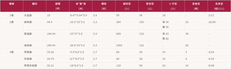 館內擁有7個多功能宴會廳,宴會桌數可同時容納60桌,會議至多可容納近1,100人的優質場地,舉凡小型私人活動、多元型態研討會,抑或是浪漫婚宴及各式活動,皆提供最便捷的地點、完善的設施以及貼心細膩的暖心服務。 不論任何需求,經驗豐富的專業團隊皆能充分掌握您的需求,確保您的活動完美呈現。