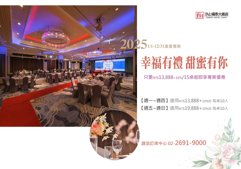*每桌招待精選紅酒一瓶 *專業視聽音控人員操作頂級燈光音響及高彩度投影設備 *婚宴佳餚鑑賞特享八折優惠(限已付訂金者、以一桌/10位為限) (需加原桌價10%服務費) *新娘休息室 *開席前新人精緻點心 *婚宴親友當日住宿享親友價優惠